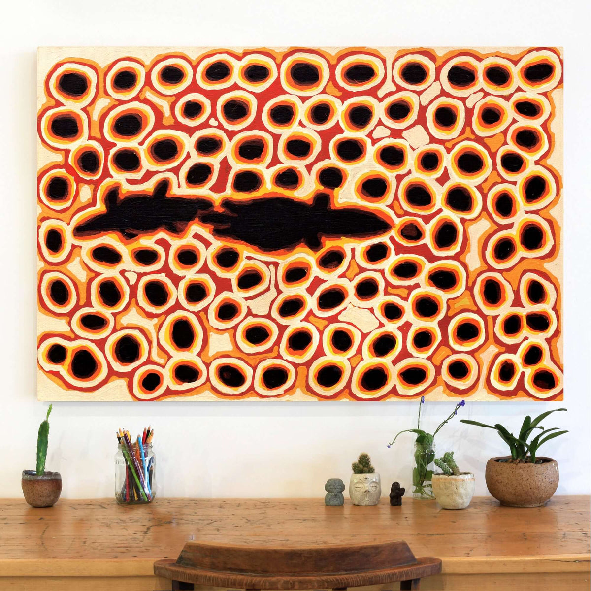 werden zu Felslöchern. Dieses Werk ist die Geschichte von Alices persönlichem Tjukurrpa (Träumen) – dem Stachelschwein. Die Kulisse sind die Felslöcher in und um das