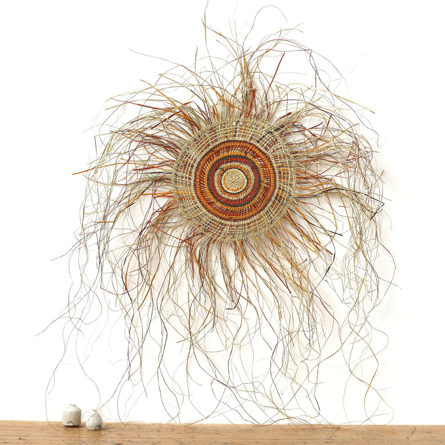 Pandanus sind palmenartige, zweihäusige Bäume und Sträucher, deren Blätter „Pandan“ häufig im traditionellen Kunsthandwerk verwendet werden. Die jungen Blätter werden geerntet und in feine Streifen geschnitten, gefolgt von einem Färbeprozess, bei dem die Streifen in Fässer mit Buschfarben, Wurzeln und Blättern verschiedener Pflanzen aus der Region gelegt werden. Der Farbstoff wird durch Schlag- und Zerkleinerungstechniken gewonnen und dann zusammen mit dem Pandanus dem Wasser zugesetzt, um diese lebendigen Farbtöne zu erzeugen. Die Pandan-Streifen werden dann zu komplizierten Körben und Matten geflochten oder für andere Designs zu Seilen gerollt.