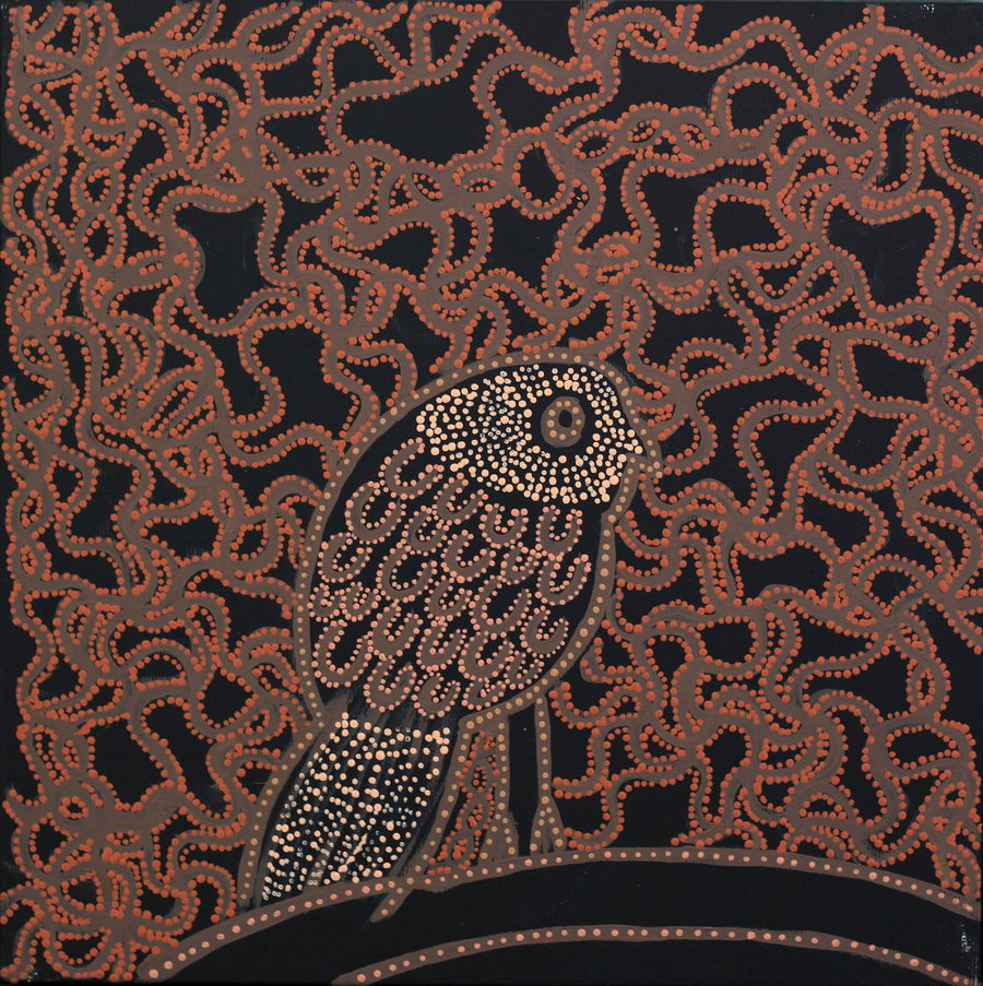 Dieses Gemälde zeigt eine der vielen Jurlpu-Arten (Vogelarten), die rund um Yuendumu leben. Der Busch rund um Yuendumu bietet Vögeln viele verschiedene Lebensräume. Viele Vogelarten leben in der Nähe von Wasserlöchern und Flüssen, wie der „Pirniny-Pirninypa“ (Schwarzstirn-Dotterel [Elseyornis melanops]). Andere leben im Spinifex-Land, wie der „Nuwiyingki“ oder „Panngarra“ (Nymphensittich [Nymphicus hollandicus]). Wieder andere bauen Nester in Bäumen, wie der „Juwayikirdi“ (Graukronenschwätzer [Pomatostomus temporalis]).