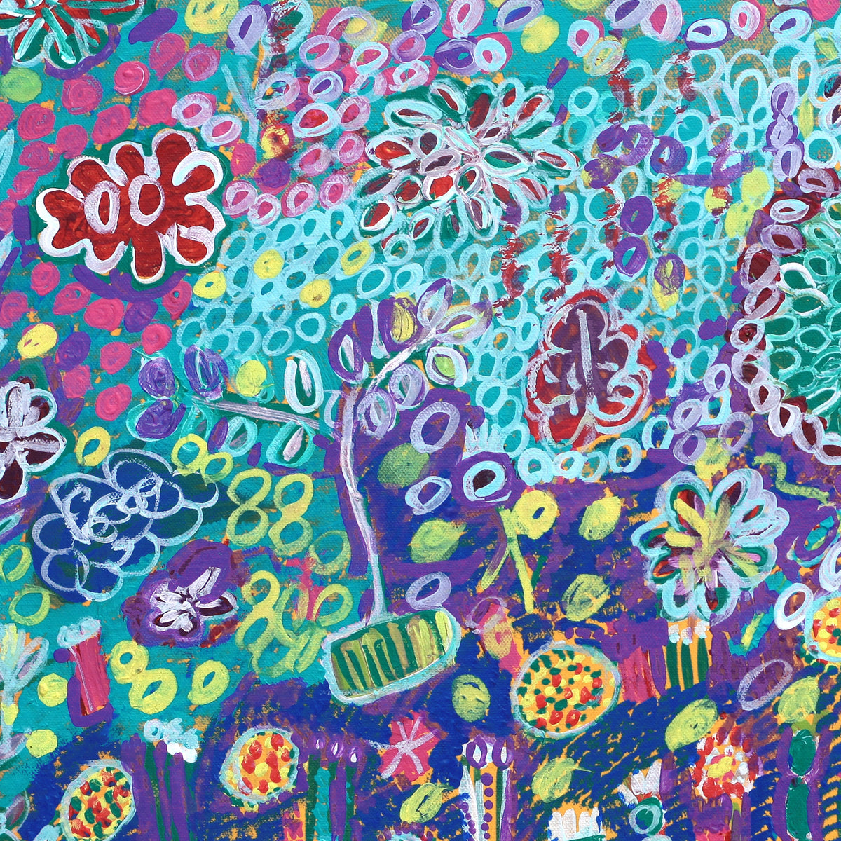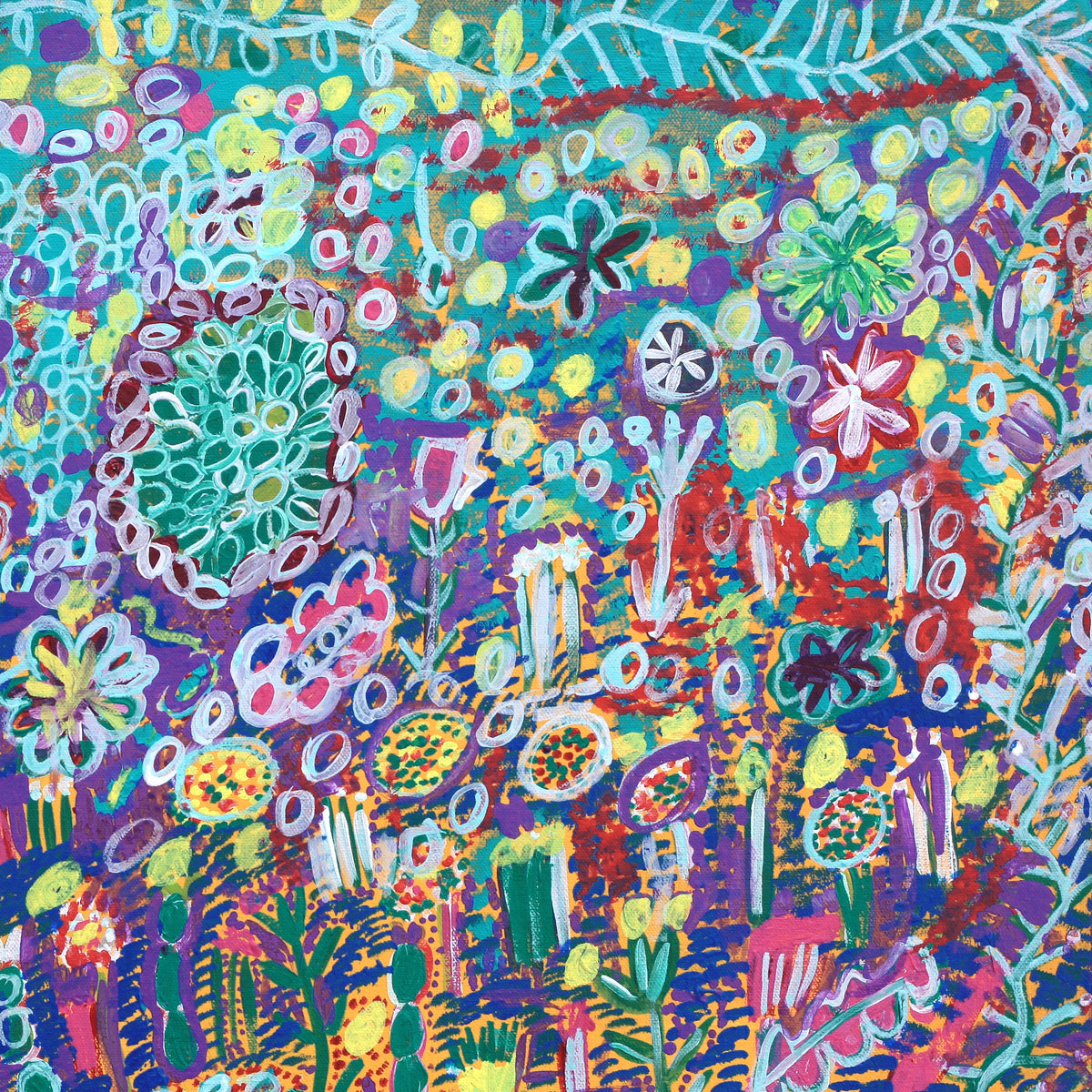 Wie Gertie Huddleston und Maureen Thompson, zwei Malerinnen aus Ngukurr, die vor ihr kamen, sind Gwenneths Gemälde reichhaltige, detaillierte Wandteppiche aus leuchtender Acrylfarbe auf Leinwand.