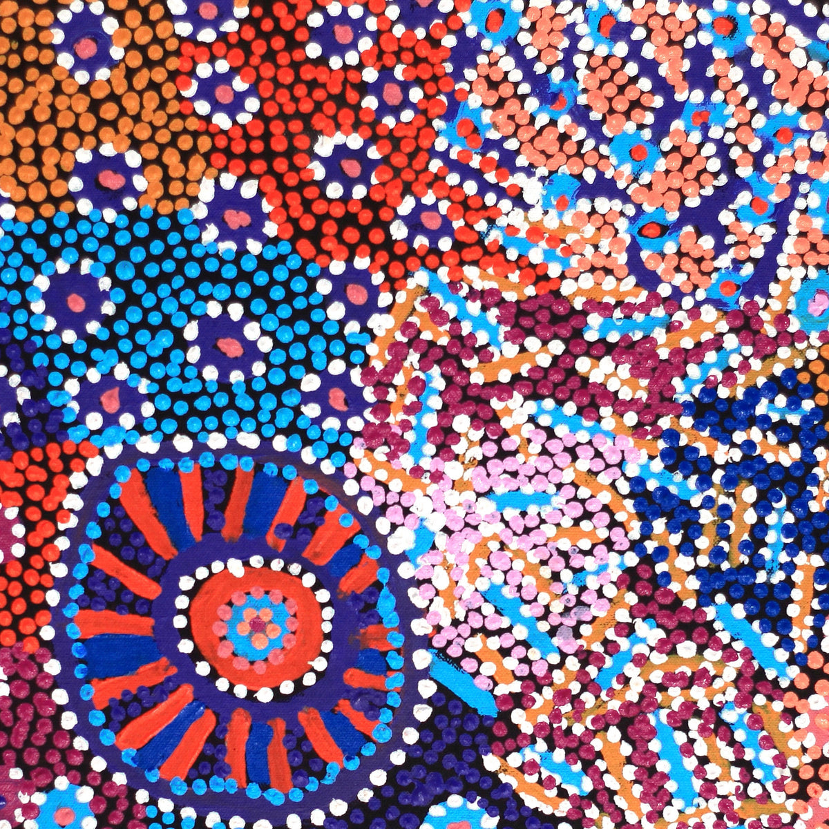 Helen Nampijinpa Robertson wurde 1944 in Mt Doreen geboren, einer ausgedehnten Rinderzuchtstation etwa 55 km westlich von Yuendumu im Northern Territory. Helen ist die Tochter von Shorty Jangala Robertson, einer bekannten Künstlerin, die auch mit Warlukurlangu Artists malt. Als Tochter von Shorty Jangala Robertson besuchte sie eine Buschschule und reiste mit ihrer Familie auf traditionelle Weise durch das Land – sie lernte den Busch, seine Sehenswürdigkeiten und die traditionellen Bräuche ihres Landes kennen – bevor sie sich in Yuendumu niederließ. Yuendumu ist eine abgelegene Aborigine-Gemeinde, die 290 km nordwestlich von Alice Springs in der Zentralwüste Australiens liegt. Helen ist mit Johnny Japaljarri Brown-Possum verheiratet, einem traditionellen Warlpiri-Tänzer, der die ganze Welt bereist hat, und einem bekannten Künstler, der mit Warlukurlangu Artists malt. Sie haben vier Töchter und zwei Söhne und viele Enkelkinder. Helen und ihr Mann sind viel gereist, ziehen aber jetzt zwischen Alice Springs und Yeundumu hin und her und verbringen immer mehr Zeit in Yuendumu, um mit Familie und Freunden zusammen zu sein. Helen malt seit 2008 bei der Warlukurlangu Artists Aboriginal Corporation, einem von Aborigines geführten Kunstzentrum in Yuendumu. Sie malt gern, weil es dabei um ihre Träume geht, insbesondere um ihr Ngapa Jukurrpa (Wasserträumen) und Ngurlu Jukurrpa (Samenträumen). Diese Träume wurden ihr seit Jahrtausenden von der Seite ihres Vaters und seiner Eltern vor ihm weitergegeben. Alle diese Geschichten beziehen sich direkt auf ihr traditionelles Land, die Besonderheiten der Landschaft, die Lebensmittel und Tiere, die man dort findet. Helen ist glücklich, in Yuendumu zu leben, wo sie in der Nähe ihrer Familie ist und auf die Jagd nach Bush Tucker und Goanna gehen kann. Sie hat auch mehr Zeit, ihre Geschichten zu malen.