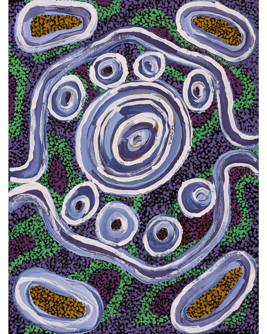 Dieses Kunstwerk stammt von Iwiṟi Arts, einer von Aṉangu geführten Organisation in Adelaide. Das Studio unterstützt Aṉangu, die aufgrund begrenzter Versorgung aus abgelegenen Gemeinden umziehen mussten, und hilft Künstlern aus den APY Lands, ihre Verbindung zu Country, Sprache und Tjukurpa zu bewahren, während sie fern der Homelands leben oder sich in der Stadt aufhalten.