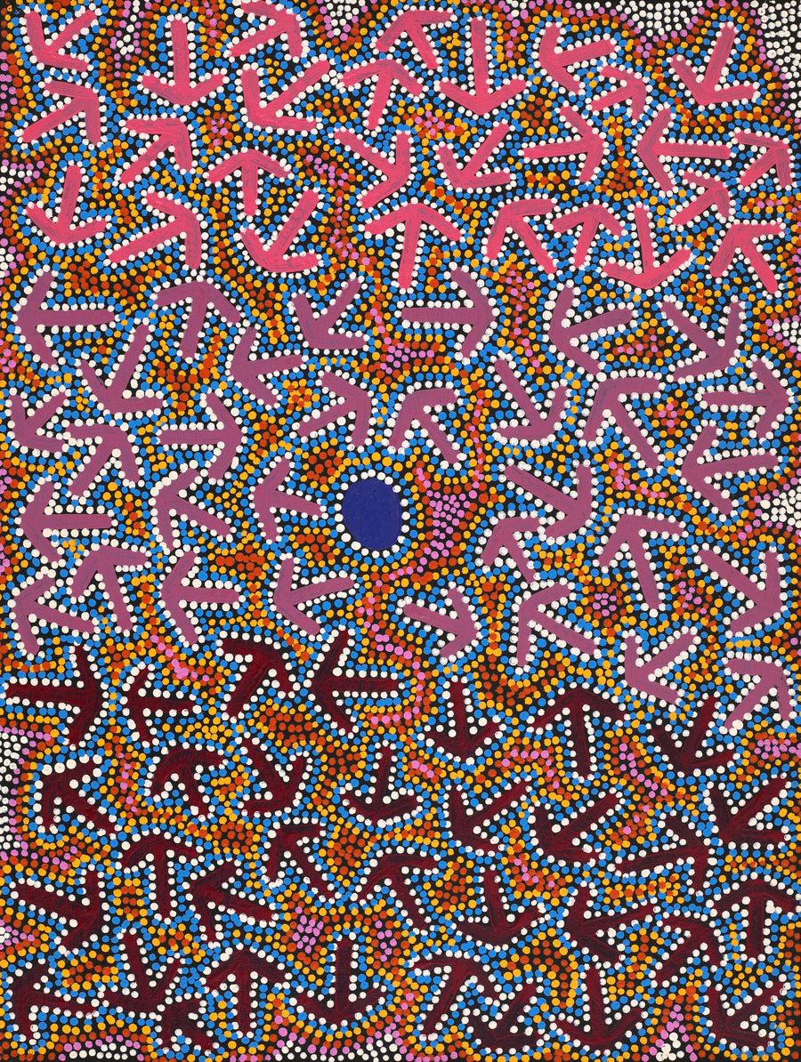 Dieses Gemälde zeigt einen „Yankirri Jukurrpa“ (emu [Dromaius novaehollandiae] träumend) aus einem Ort namens Ngarlikurlangu, etwa 50 km nördlich von Yuendumu. Die „Kirda“ (Besitzer) dieses Träumens sind Nangala/Nampijinpa-Frauen und Jangala/Jampijinpa-Männer.