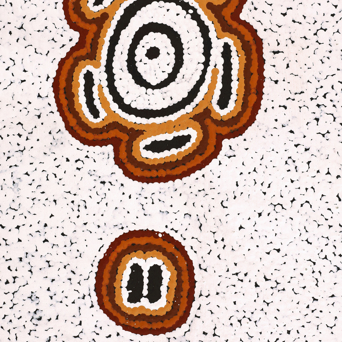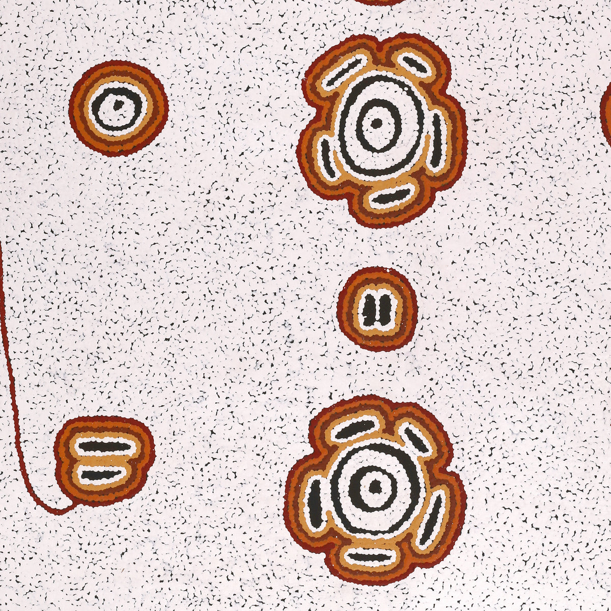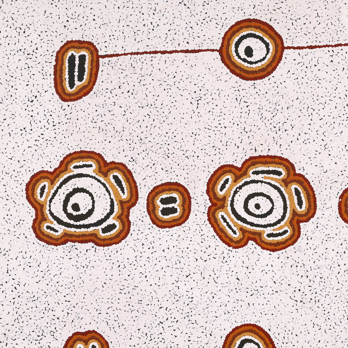 Dieses Gemälde zeigt die Pamapardu Jukurrpa (träumende Fliegende Ameise) aus Wapurtali, westlich von Yuendumu. „Pamapardu“ ist der Warlpiri-Name für die fliegenden Ameisen oder Termiten, die die großen Ameisenhaufen bauen, die man überall im Warlpiri-Land findet. Dieses Land gehört den Frauen der Nakamarra/Napurrurla und den Männern der Jakamarra/Jupurrurla. „Pamapardu“ sind fliegende Ameisen. Sie bauen Erdhügel („Mingkirri“), die im Tanami-Gebiet häufig vorkommen. Wenn es im Sommer schwer regnet, werden die „Mingkirri“ überschwemmt, sodass den „Pamapardu“ Flügel wachsen und sie davonfliegen, um sich ein neues Zuhause zu suchen. Sie folgen ihren Königinnen zu trockenen Hügeln oder um ein neues zu bauen. Wenn sie ihr neues Zuhause gefunden haben, verlieren sie ihre Flügel. In diesem Stadium können sie eingesammelt, über Kohlen leicht gegart und gegessen werden. Wenn sie zu Boden fallen, sammeln die Frauen sie ein, um sie zu essen, weil sie schön süß sind. In zeitgenössischen Warlpiri-Gemälden wird traditionelle Ikonographie verwendet, um die Jukurrpa, bestimmte Orte und andere Elemente darzustellen. Wenn diese Jukurrpa-Geschichte gemalt wird, werden konzentrische Kreise verwendet, um die „Mingkirri“ und die in der Geschichte vorkommenden Felslöcher darzustellen, darunter das zentrale in Wapurtali (Mt Singleton). Um die Kreise herum werden oft Striche dargestellt, um das „Pamapardu“ darzustellen.