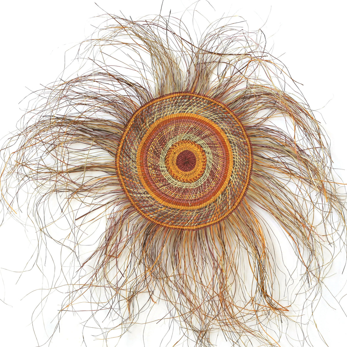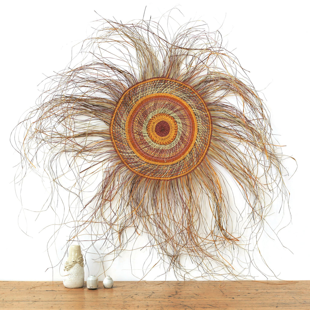 Pandanus sind palmenartige, zweihäusige Bäume und Sträucher, deren Blätter „Pandan“ häufig im traditionellen Kunsthandwerk verwendet werden. Die jungen Blätter werden geerntet und in feine Streifen geschnitten, gefolgt von einem Färbeprozess, bei dem die Streifen in Fässer mit Buschfarben, Wurzeln und Blättern verschiedener Pflanzen aus der Region gelegt werden. Der Farbstoff wird durch Schlag- und Zerkleinerungstechniken gewonnen und dann zusammen mit dem Pandanus dem Wasser zugesetzt, um diese lebendigen Farbtöne zu erzeugen. Die Pandan-Streifen werden dann zu komplizierten Körben und Matten geflochten oder für andere Designs zu Seilen gerollt.
