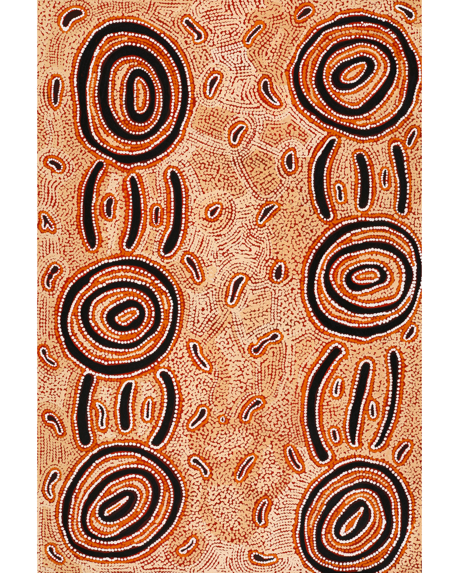 Dieses Kunstwerk stammt von Warlukurlangu Artists in Yuendumu. Das Kunstzentrum vertritt Warlpiri-Künstler aus Yuendumu und Nyirripi in der Tanami-Wüste nordwestlich von Alice Springs. Diese abgelegene Region aus rotem Sand und offener Wüstenlandschaft ist zentral für die Geschichten und das Wissen, die in den Gemälden vermittelt werden.