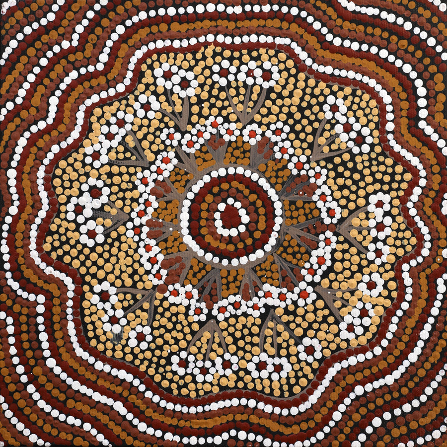 Dieses Kunstwerk stammt von Warlukurlangu Artists in Yuendumu. Das Kunstzentrum vertritt Warlpiri-Künstler aus Yuendumu und Nyirripi in der Tanami-Wüste nordwestlich von Alice Springs. Diese abgelegene Region aus rotem Sand und offener Wüstenlandschaft ist zentral für die Geschichten und das Wissen, die in den Gemälden vermittelt werden.