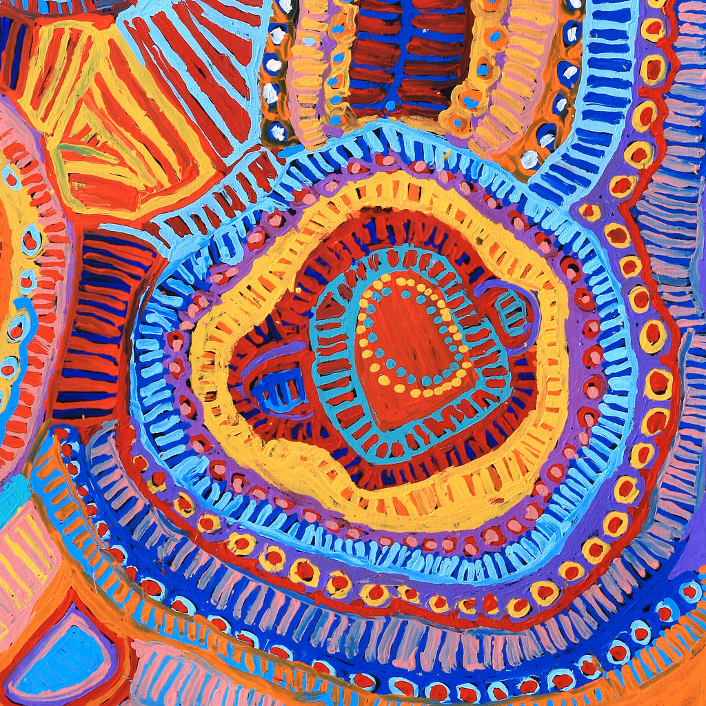 In Warlpiri-Gemälden wird traditionelle Ikonographie zur Darstellung des Jukurrpa und anderer Elemente verwendet. In diesem Werk sind die Brustkorb der Jampijinpa, Napangardi und ihrer Hundefamilie abgebildet. Ihre Rippen sind auch als Landschaftsmerkmale im Yankirrikirlangu-Gebiet zu erkennen. Konzentrische Kreise werden verwendet, um die „Ngapa“ (Wasserlöcher) rund um Yankirrikirlangu darzustellen.