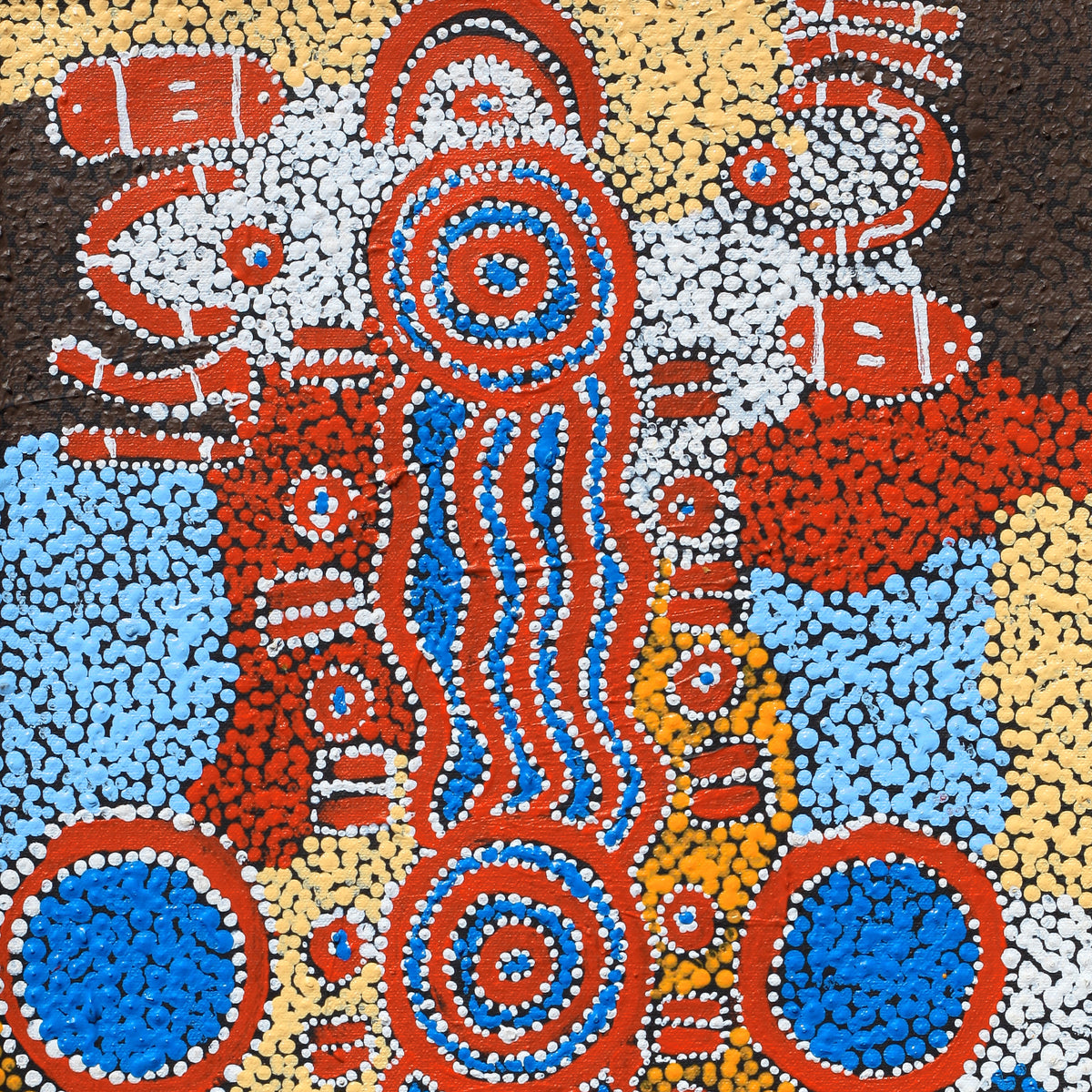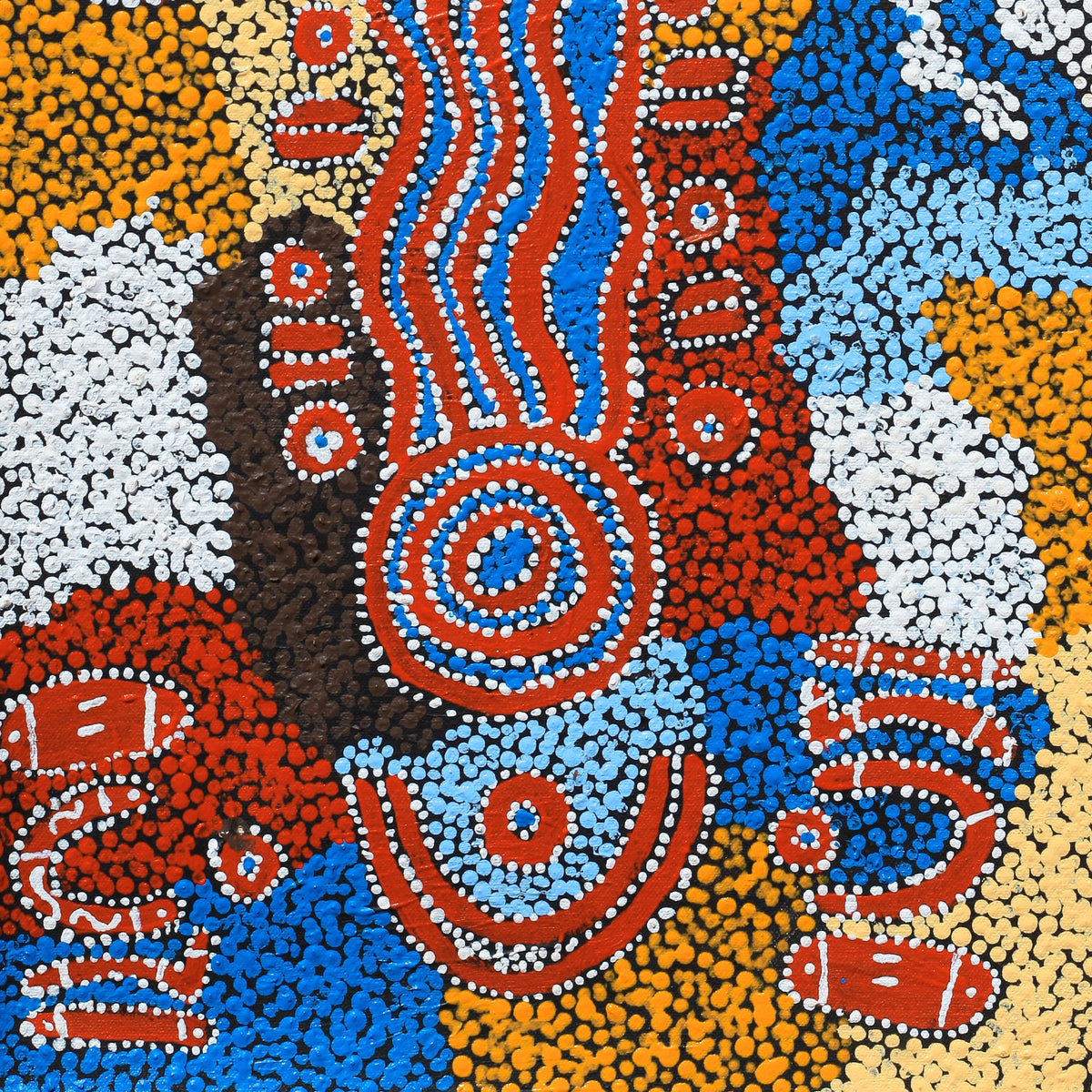 Der in diesem Gemälde dargestellte Ort ist Puyurru, westlich von Yuendumu. In den normalerweise trockenen Bachbetten befinden sich „Mulju“ (Einschwemmungen) oder natürlich vorkommende Brunnen. Die „Kirda“ (Eigentümer) dieser Website sind Nangala/Nampijinpa-Frauen und Jangala/Jampijinpa-Männer. Zwei Jangala-Männer, Regenmacher, sangen den Regen und lösten einen riesigen Sturm aus. Der Sturm zog von Osten nach Westen durch das Land und zog zunächst mit einem „Pamapardu Jukurrpa“ (träumende Termite) von Warntungurru nach Warlura, einem Wasserloch 8 Meilen östlich von Yuendumu. Bei Warlura blies ein Gecko namens Yumariyumari den Sturm auf Lapurrukurra und Wilpiri weiter. Blitze schossen in Wirnpa (auch Mardinymardinypa genannt) und Kanaralji. An dieser Stelle enthält der Dreaming-Track auch das „Kurdukurdu mangkurdu Jukurrpa“ (träumende Kinder der Wolken). Die Wasserträumerin baute Hügel in Ngamangama aus Babywolken und steckte auch in Jukajuka lange, spitze Wolken in den Boden, wo sie noch heute als Felsformationen zu sehen sind.