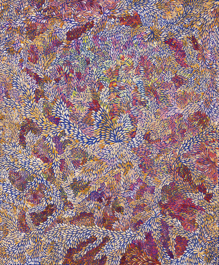 Dieses Gemälde zeigt die Buschsamen, die vom Ininti-Baum (Fledermauskorallenbaum) stammen. Der Baum stammt aus der westlichen Wüste Zentralaustraliens und wächst im Sand rund um Bachbetten. Die Ininti wachsen reichlich im Muruntji-Land, wo der Künstler viel Zeit damit verbracht hat, die Samen zu sammeln. Muruntji liegt westlich von Kungkayunti (Browns Bore), der Außenstation, aus der die Familie des Künstlers stammt. Sowohl Patricia Multa als auch ihre Tochter Virgillia Multa malen die Ininti in Muruntji und bringen die Farben und Bewegungen des Ininti-Baums sowie seiner Samen und Blüten im Laufe der Jahreszeiten zum Ausdruck. Patricia erinnert sich, wie sie als Kind die Samen sammelte und daraus Halsketten verarbeitete. Die Samen können im Sand oder in den noch an den Bäumen befindlichen Schoten gefunden werden. Die Samen wachsen von Natur aus in verschiedenen Farben, von dunkelrot bis hellgelb. Die Blüten sind ebenso lebendig und reichen von sattem Orange bis Rot. Noch heute werden Ininti gesammelt und bei Ikuntji Artists zu Schmuck verarbeitet.