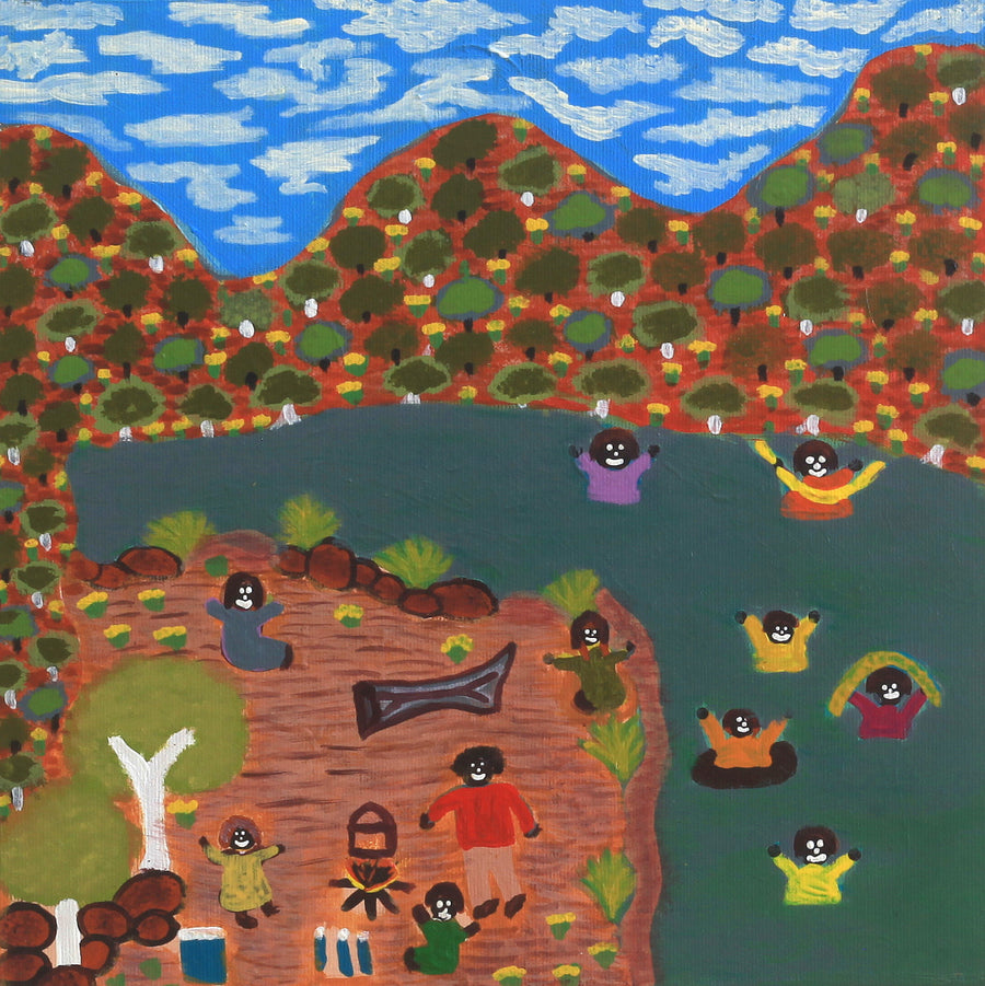 Dieses Gemälde handelt von einer Familie, die draußen im Busch ein Picknick macht – Kinder schwimmen im Wasserloch bei Twenty Mile. Alle glücklich. Twenty Mile liegt nördlich der Laramba Community