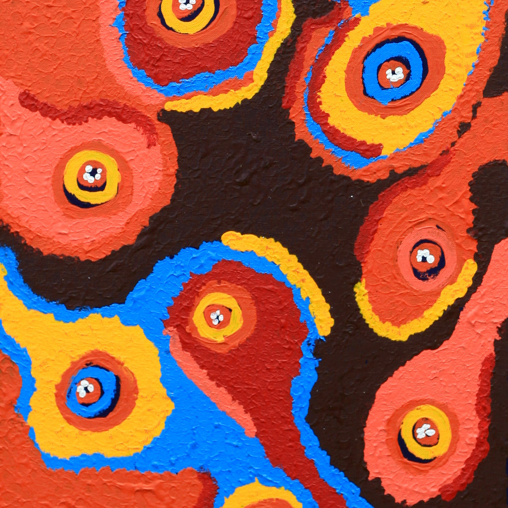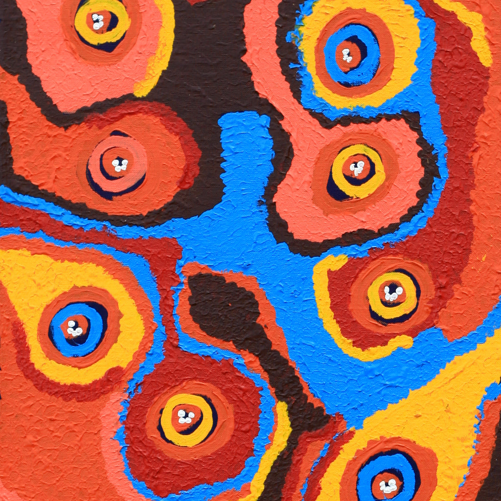 Dieses „Jukurrpa“ (Träumen) stammt aus Mina Mina, einem sehr wichtigen Ort zum Träumen von Frauen weit westlich von Yuendumu in der Nähe des Lake Mackay und der Grenze zu Washington. Die „Kirda“ (Besitzer) dieses Dreaming sind Napangardi/Napanangka-Frauen und Japangardi/Japanangka-Männer; Das Gebiet ist den Napangardi- und Napanangka-Frauen heilig. In Mina Mina gibt es eine Reihe von „Mulju“ (Wasserbecken) und eine „Maluri“ (Tonpfanne).