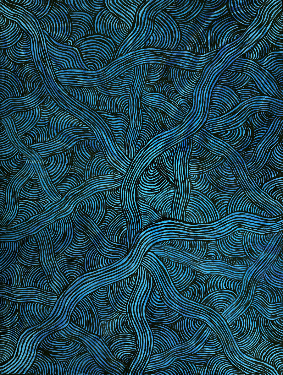 The country is full of sandhills and majestic desert oaks through which the wild camels roam. Her artworks depict the Tjukurrpa stories connected to her country: Pintirri Mungangka and Women's Hairstring Dreaming.