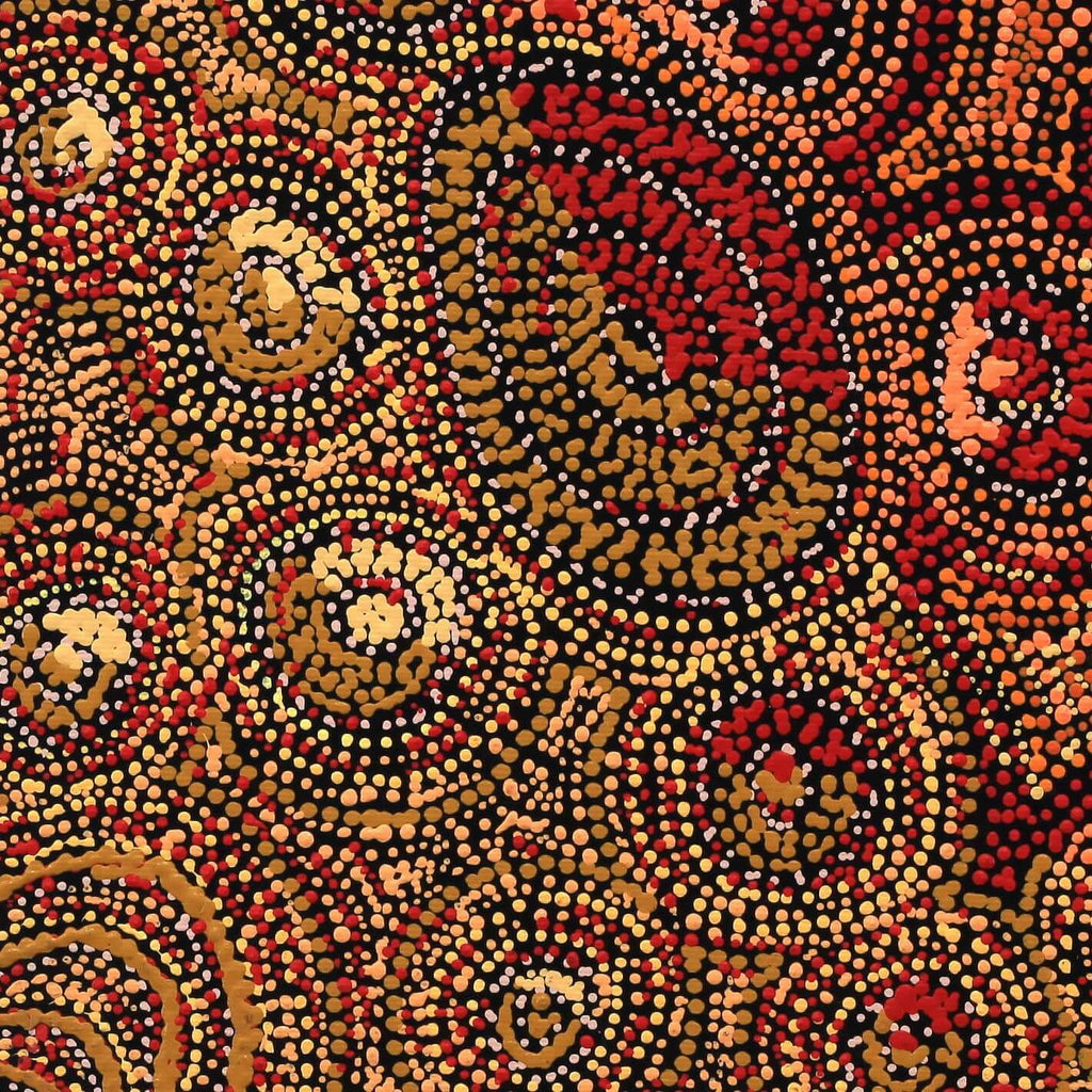 In contemporary Warlpiri paintings, traditional iconography is used to represent the ‘Jukurrpa’ (Dreaming), associated sites, and other elements. In many paintings of this Dreaming, short dashes are often used to represent ‘mangkurdu’ (cumulus & stratocumulus clouds), and longer, flowing lines represent ‘ngawarra’ (flood waters). Small circles are used to depict ‘mulju’ (soakages) and river beds.