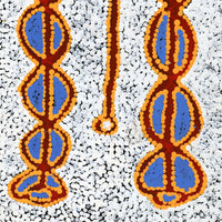 This painting depicts the Pamapardu Jukurrpa (Flying Ant Dreaming) from Wapurtali, west of Yuendumu. 'Pamapardu' is the Warlpiri name for the flying ants or termites that build the large anthills found throughout Warlpiri country. This country belongs to Nakamarra/Napurrurla women and Jakamarra/Jupurrurla men. 'Pamapardu' are flying ants. They build earth mounds (‘mingkirri’) that are common in the Tanami area. When heavy rains come in summer the ‘mingkirri’ get flooded out, so the ‘pamapardu’ grow wings and fly off to make new homes, following their queens to dry mounds or to build a new. When they have found their new home they drop their wings. In this stage they can be collected, lightly cooked in coals and eaten. As they fall to the ground women collect them to eat because they are nice and sweet. In contemporary Warlpiri paintings traditional iconography is used to represent the Jukurrpa, particular sites and other elements. When this Jukurrpa story is painted concentric circles are used to represent the ‘mingkirri’ and the rockholes involved in the story, including the central one at Wapurtali (Mt Singleton). Dashes are often depicted around the circles to represent the ‘pamapardu’.