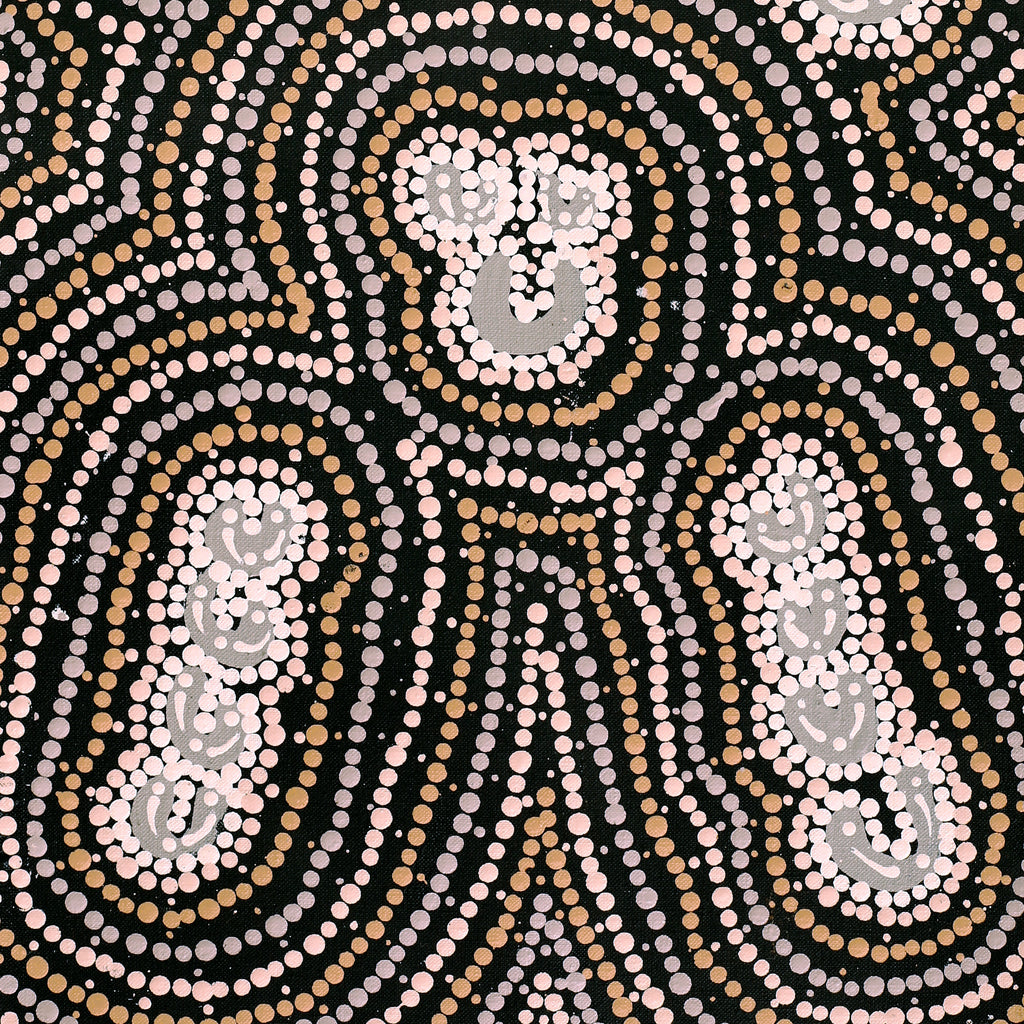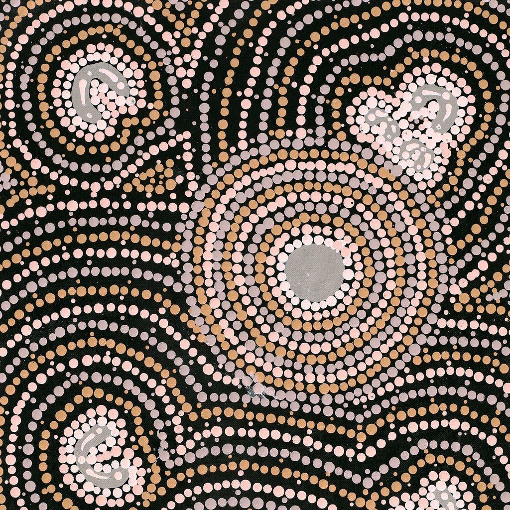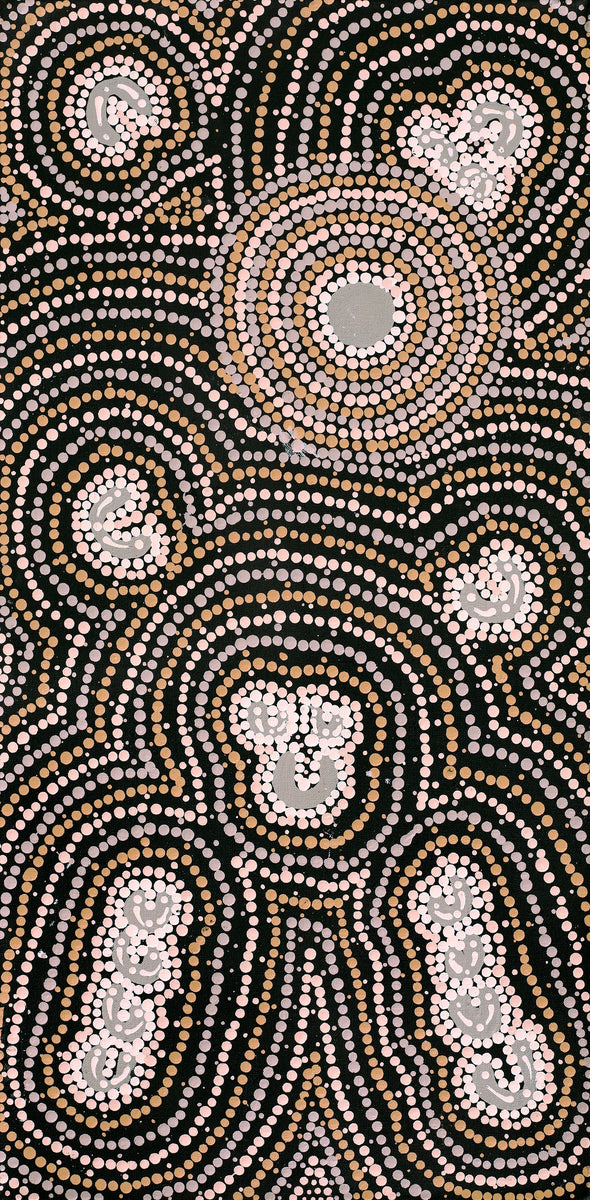 The subject of this work is Lappi Lappi, a rock hole near Lake Hazlett, about 90 km northwest of Lake Mackay in Western Australia. The country belongs to Nampijinpa/Jampijinpa and Nangala/Jangala skin groups. Located in a sheltered basin, the rock hole at Lappi Lappi is a permanent source of water, and is surrounded by country rich in bush tucker. In the time of the Jukurrpa (Dreamtime) many mothers with young children would gather there because it was a safe place to stay. The rock hole at Lappi Lappi is home to a ‘warnayarra’, a rainbow serpent that travels underground between various rock holes. One day, women were gathered at the rock hole with their children, singing and dancing. When the ‘warnayarra’ heard the sound of voices, it travelled silently towards them, under the water. When it reached the edge of the rock hole, it rose out of the water and ate them all.
