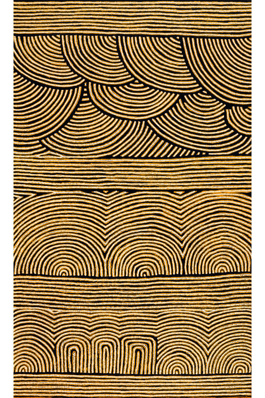 This painting depicts Nakamarra and Napurrurla women hunting for bush foods. The ‘kirda’ (owners) for this story are Nakamarra/Napurrurla women and Jakamarra/Jupurrurla men. Yumurrpa and Wapurtali are two major Dreaming sites owned by the Nakamarra/Jakamarra and Napurrurla/Jupurrurla subsections; these sites are also associated with bush food Dreamings. Yumurrpa is a major waterhole to the northwest of Yuendumu and a ‘yarla’ (bush potato [Ipomea costata]) Dreaming site. The area north of Wapurtali/Yintaramurru (Mt. Singleton) is a ‘wanakiji’ (bush tomato [Solanum chippendalei]) Dreaming site.