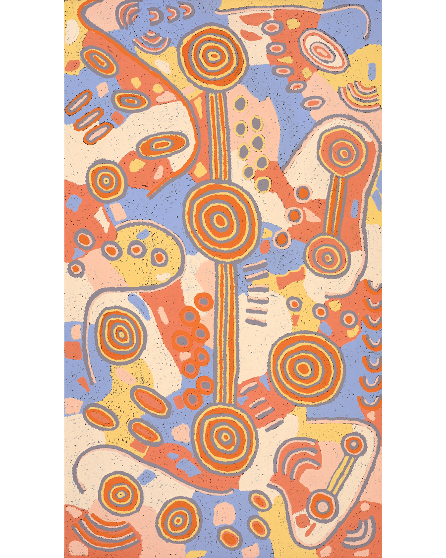 This artwork comes from Warlukurlangu Artists in Yuendumu. The art centre represents Warlpiri artists from Yuendumu and Nyirripi, located in the Tanami Desert northwest of Alice Springs. This remote region of red sand and open desert Country is central to the stories and knowledge shared through the paintings.
