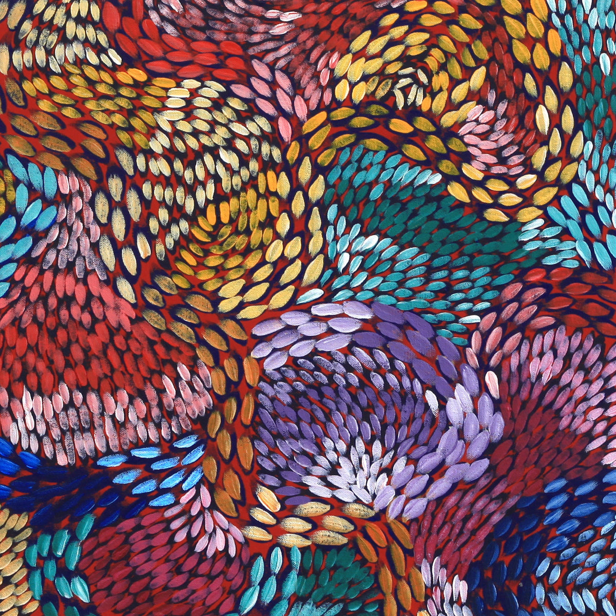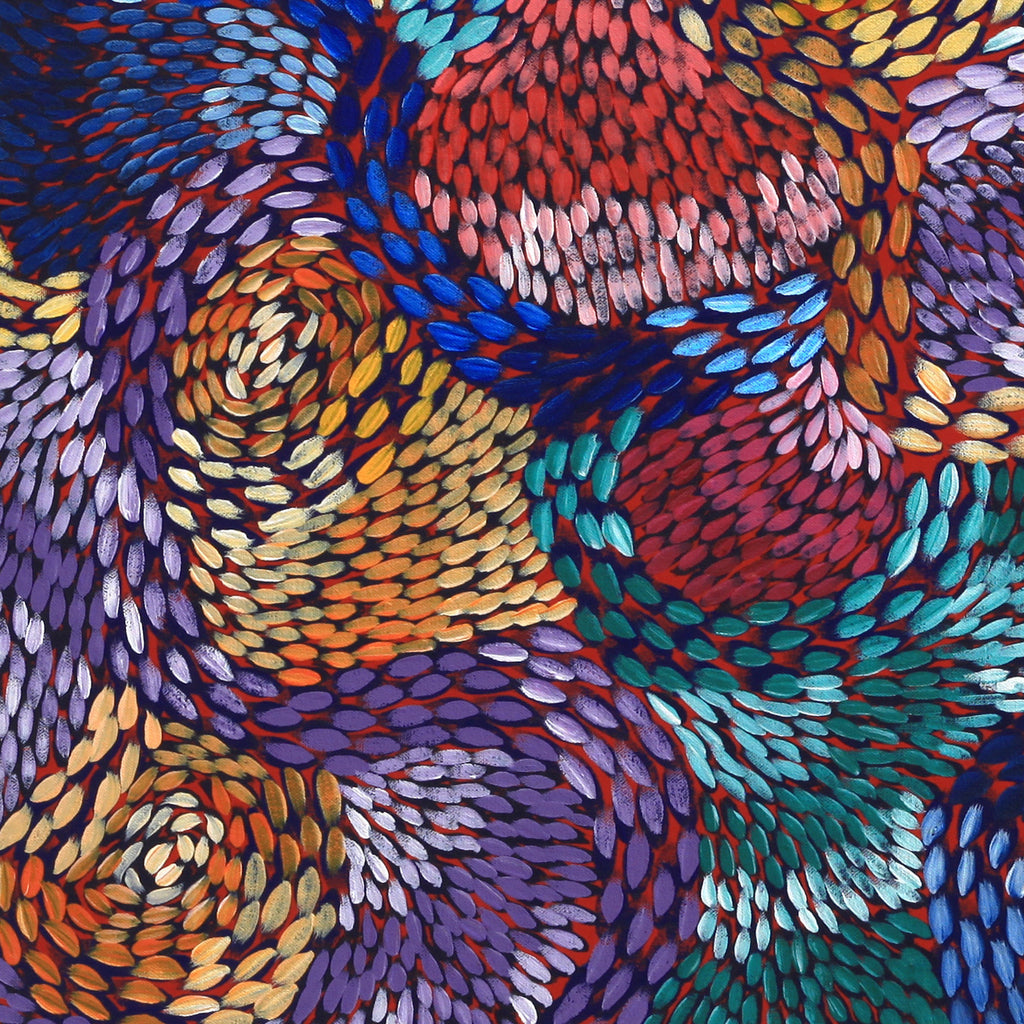 This painting shows the Yalka Dreaming (bush onion) which is situated in a place called Analy, close to Town Bore Outstation. Bush onions grow after the rain and are collected by all the women.The yalka are found underneath the surface and can be eaten raw or cooked in the hot sand next to the campfire. Paintings referring to this Dreaming show diverse motifs such as plants, leaves, seeds, layers or roots.