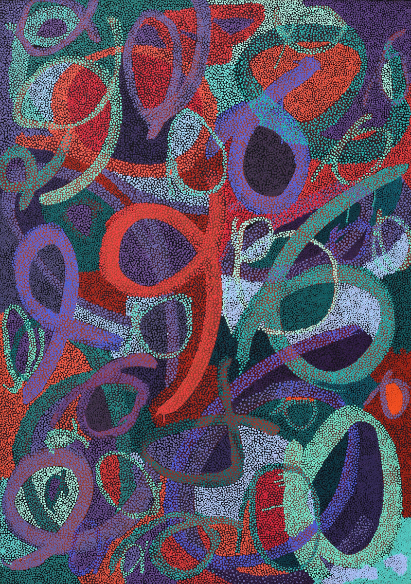 In contemporary Warlpiri paintings, traditional iconography is used to represent the ‘Jukurrpa’ (Dreaming). Short dashes are often used to represent ‘mangkurdu’ (cumulus & stratocumulus clouds), and longer, flowing lines represent ‘ngawarra’ (flood waters). Small circles are used to depict ‘mulju’ (soakages) and river bed.