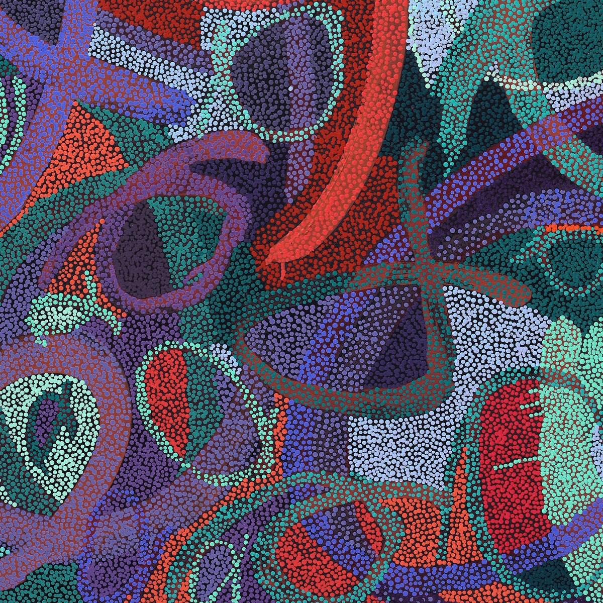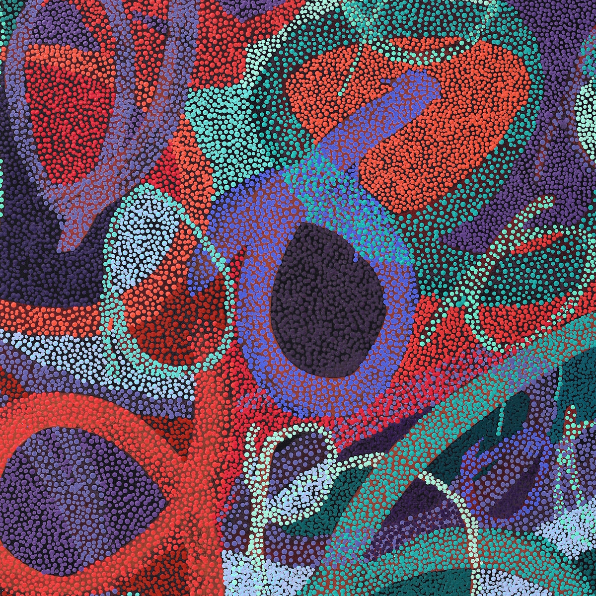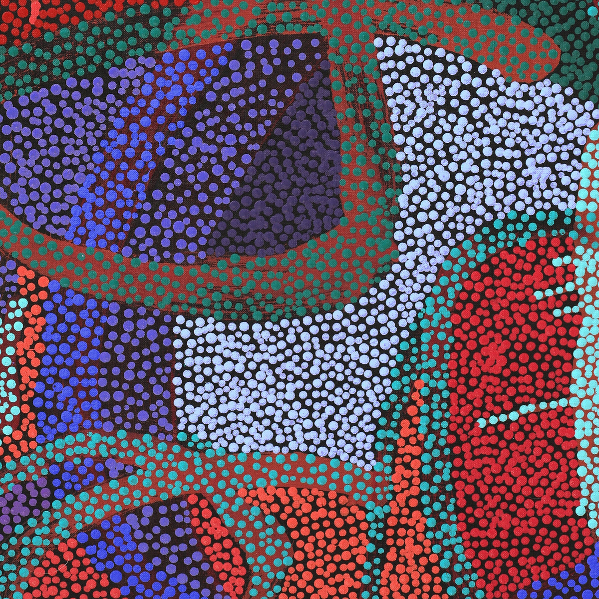 The site depicted in this painting is Puyurru, west of Yuendumu. In the usually dry creek beds are ‘mulju’ (soakages), or naturally occurring wells. The 'kirda' (owners) for this site are Nangala/Nampijinpa women and Jangala/Jampijinpa men. Two Jangala men, rainmakers, sang the rain, unleashing a giant storm. The storm travelled across the country from the east to the west, initially travelling with a ‘pamapardu Jukurrpa’ (termite Dreaming) from Warntungurru to Warlura, a waterhole 8 miles east of Yuendumu. At Warlura, a gecko called Yumariyumari blew the storm on to Lapurrukurra and Wilpiri. Bolts of lightning shot out at Wirnpa (also called Mardinymardinypa) and at Kanaralji. At this point the Dreaming track also includes the ‘kurdukurdu mangkurdu Jukurrpa’ (children of the clouds Dreaming). The water Dreaming built hills at Ngamangama using baby clouds and also stuck long pointy clouds into the ground at Jukajuka, where they can still be seen today as rock formations.