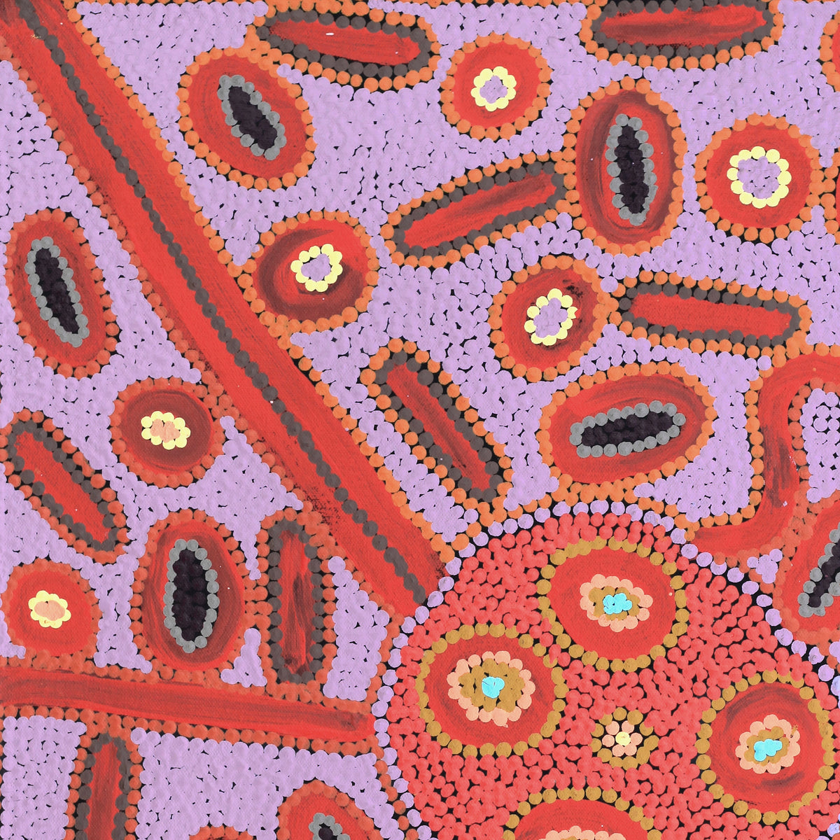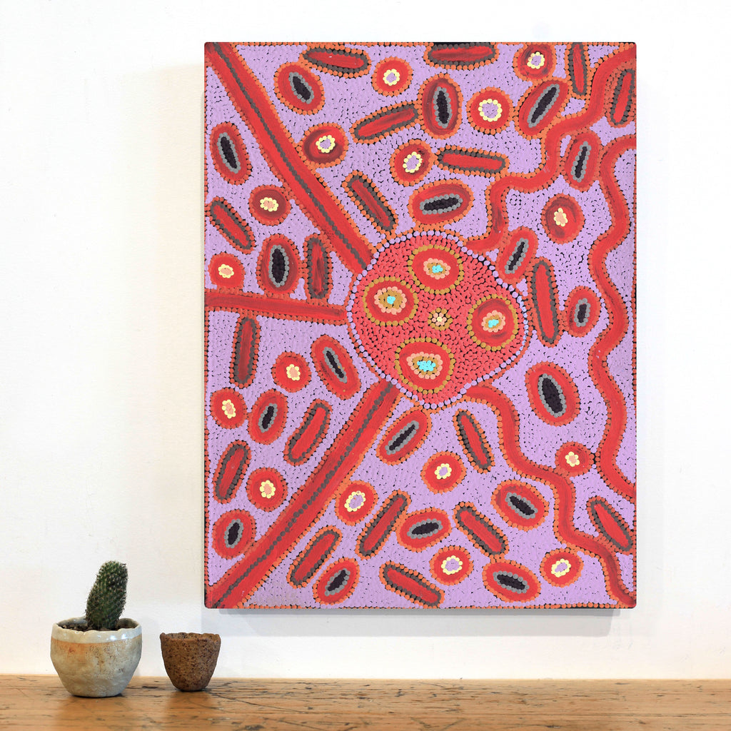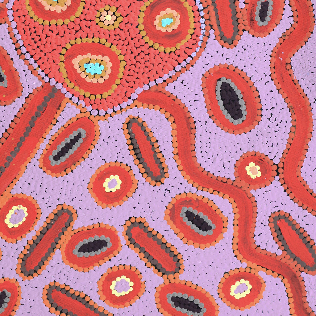 Freda has been painting with Warlukurlangu Artists Aboriginal Corporation, an Aboriginal owned and governed art centre located in Yuendumu, since 1992 but did not have much time in the early years until 2004 when she began to paint consistently with the art centre. She paints her Grandfather’s Jukurrpa stories, Dreamings which relate directly to her land, its features and the plants and animals that inhabit it. These stories have been passed down over many generations for millennia.