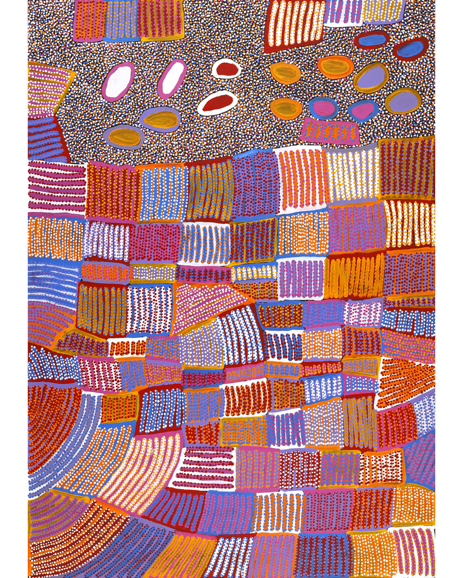 This artwork comes from Warlukurlangu Artists in Yuendumu. The art centre represents Warlpiri artists from Yuendumu and Nyirripi, located in the Tanami Desert northwest of Alice Springs. This remote region of red sand and open desert Country is central to the stories and knowledge shared through the paintings.