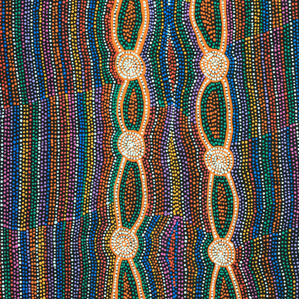 This ‘Jukurrpa’ (Dreaming) comes from Mina Mina, a very important women’s Dreaming site far to the west of Yuendumu near Lake Mackay and the WA border. The ‘kirda’ (owners) of this Dreaming are Napangardi/Napanangka women and Japangardi/Japanangka men; the area is sacred to Napangardi and Napanangka women. There are a number of ‘mulju’ (water soakages) and a ‘maluri’ (clay pan) at Mina Mina.