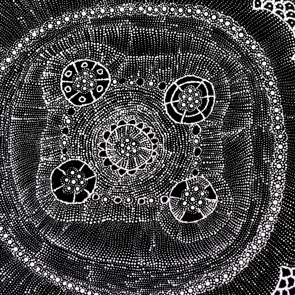 This Jukurrpa belongs to women of the Nakamarra/Napurrurla subsections and to Jakamarra/Jupurrurla men. This Dreaming is associated with a place called Jaralypari, north of Yuendumu. Lukarrara (desert fringe-rush [Fimbristylis oxystachya & Fimbristylis eremophila]) is a grass with an edible seed. The seeds are traditionally ground on a large stone (‘ngatinyanu’) with a smaller stone (‘ngalikirri’) to make flour. This flour is mixed with water (‘ngapa’) to make damper cakes which are cooked and eaten. In Warlpiri traditional paintings iconography is used to represent the Jukurrpa, particular sites and other elements. Large concentric circles often represent the site of Jaralypari and also the seed bearing grass Lukurrara. ‘U’ shapes can depict the Karnta (women) collecting ‘lukarrara’ and straight lines are frequently used to portray seeds that fall down to the ground and are also collected by women using their ‘parrajas’ (wooden food carriers) and ‘karlangu’ (digging sticks).