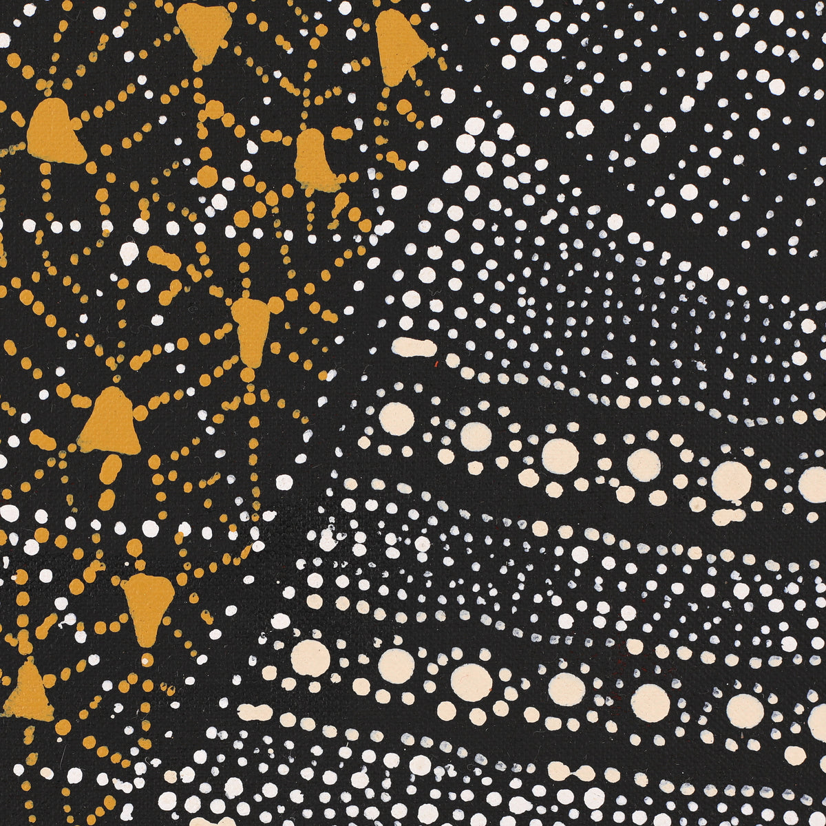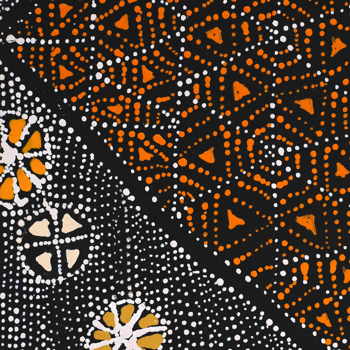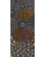 Hilda Nakamarra Rogers was born in Papunya, an Aboriginal community located 240 km northwest of Alice Springs in the NT of Australia. She attended her local school in Papunya before going to Yirara College in Alice Springs. After college she returned to Papunya and worked at the school teaching language. Hilda married a man from Yuendumu in 1987 and moved to Yuendumu, a neighboring community to Papunya where many of the same families live. Later she moved to Nyirripi, a remote Aboriginal community approximately 160 km west of Yuendumu where she still lives. She is married to Desmond Williams and they have two sons, Micah and Eliezer. She also has a granddaughter who Hilda enjoys looking after. Both her parents are deceased and were artists at Papunya. As a child she watched her parents paint and listened to their stories. Hilda started painting in 1988 and since 2003 has begun painting consistently with Warlukurlangu Artists Aboriginal Corporation, an Aboriginal owned and governed art centre in Yuendumu. Hilda paints Bush tucker stories, in particular Ngurlu Jukurrpa (Native Seed Dreaming). Occasionally she paints her husband’s dreaming, Yurrumpi Jukurrpa (Honey Ant Dreaming) and her father’s dreaming, Ngapa Jukurrpa (Water Dreaming), Dreamings which have been passed down through the generations for millennia. She likes sport and sometimes goes hunting for goanna and kangaroo and looking for bush tucker. She also enjoys visiting her husband’s family who live in Yuendumu.