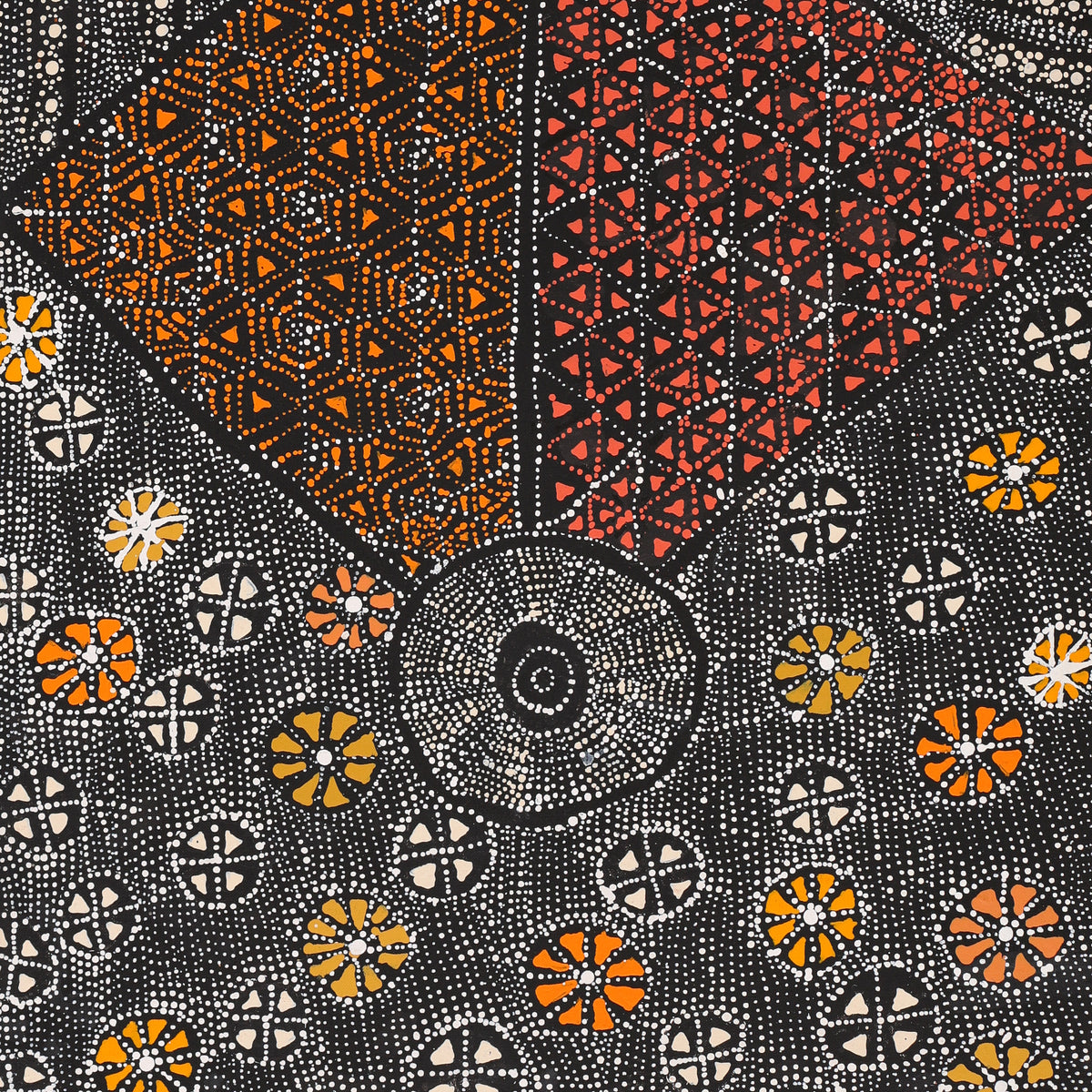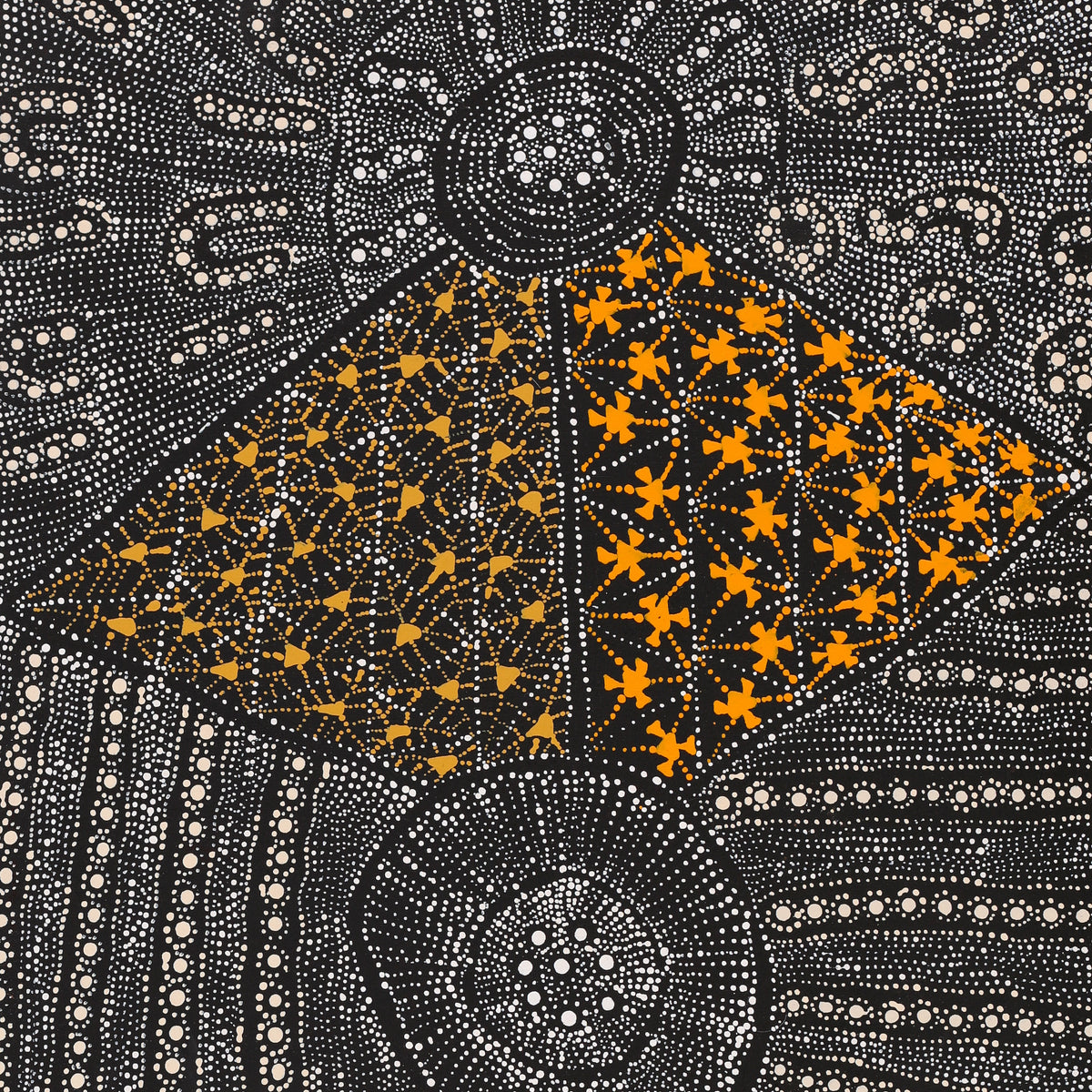 This Jukurrpa belongs to women of the Nakamarra/Napurrurla subsections and to Jakamarra/Jupurrurla men. This Dreaming is associated with a place called Jaralypari, north of Yuendumu. Lukarrara (desert fringe-rush [Fimbristylis oxystachya & Fimbristylis eremophila]) is a grass with an edible seed. The seeds are traditionally ground on a large stone (‘ngatinyanu’) with a smaller stone (‘ngalikirri’) to make flour. This flour is mixed with water (‘ngapa’) to make damper cakes which are cooked and eaten. In Warlpiri traditional paintings iconography is used to represent the Jukurrpa, particular sites and other elements. Large concentric circles often represent the site of Jaralypari and also the seed bearing grass Lukurrara. ‘U’ shapes can depict the Karnta (women) collecting ‘lukarrara’ and straight lines are frequently used to portray seeds that fall down to the ground and are also collected by women using their ‘parrajas’ (wooden food carriers) and ‘karlangu’ (digging sticks).