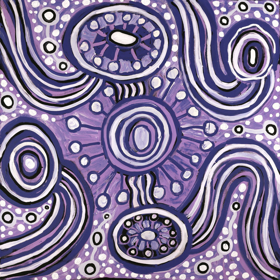 This artwork comes from Iwiṟi Arts, an Aṉangu-led organisation in Adelaide established by Aṉangu who had moved from remote communities due to limited services and chronic health needs. The studio supports artists visiting or living in the city from the APY Lands, helping maintain strong cultural connection to Country, language and Tjukurpa while away from homelands.
