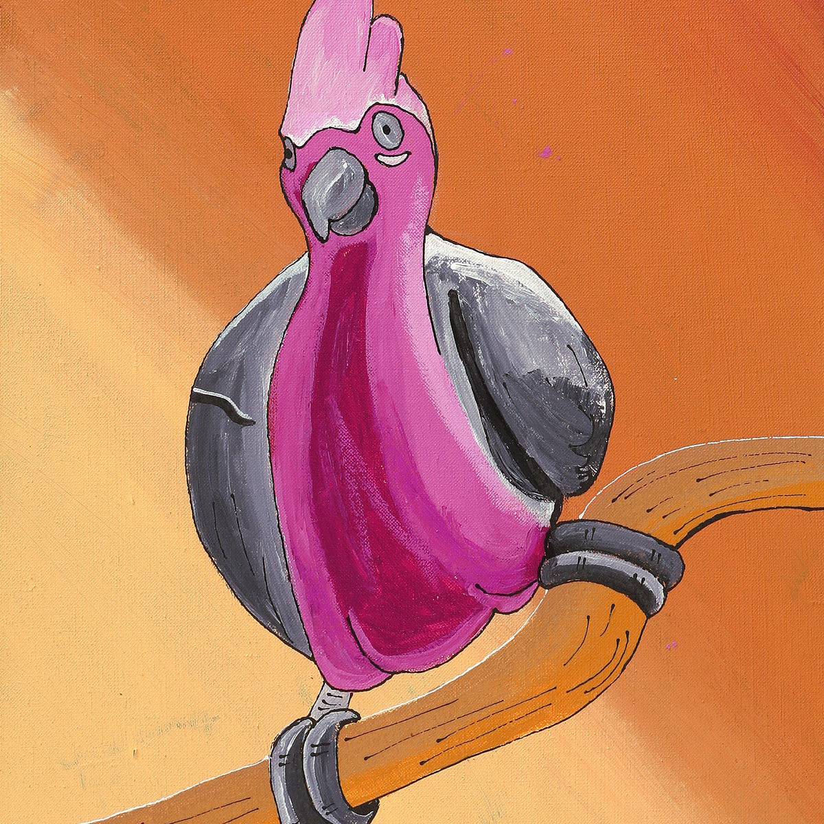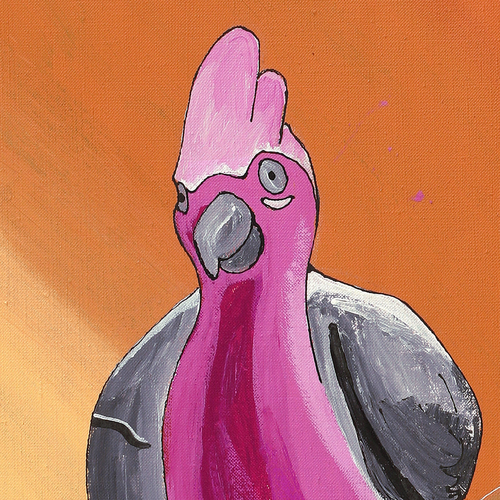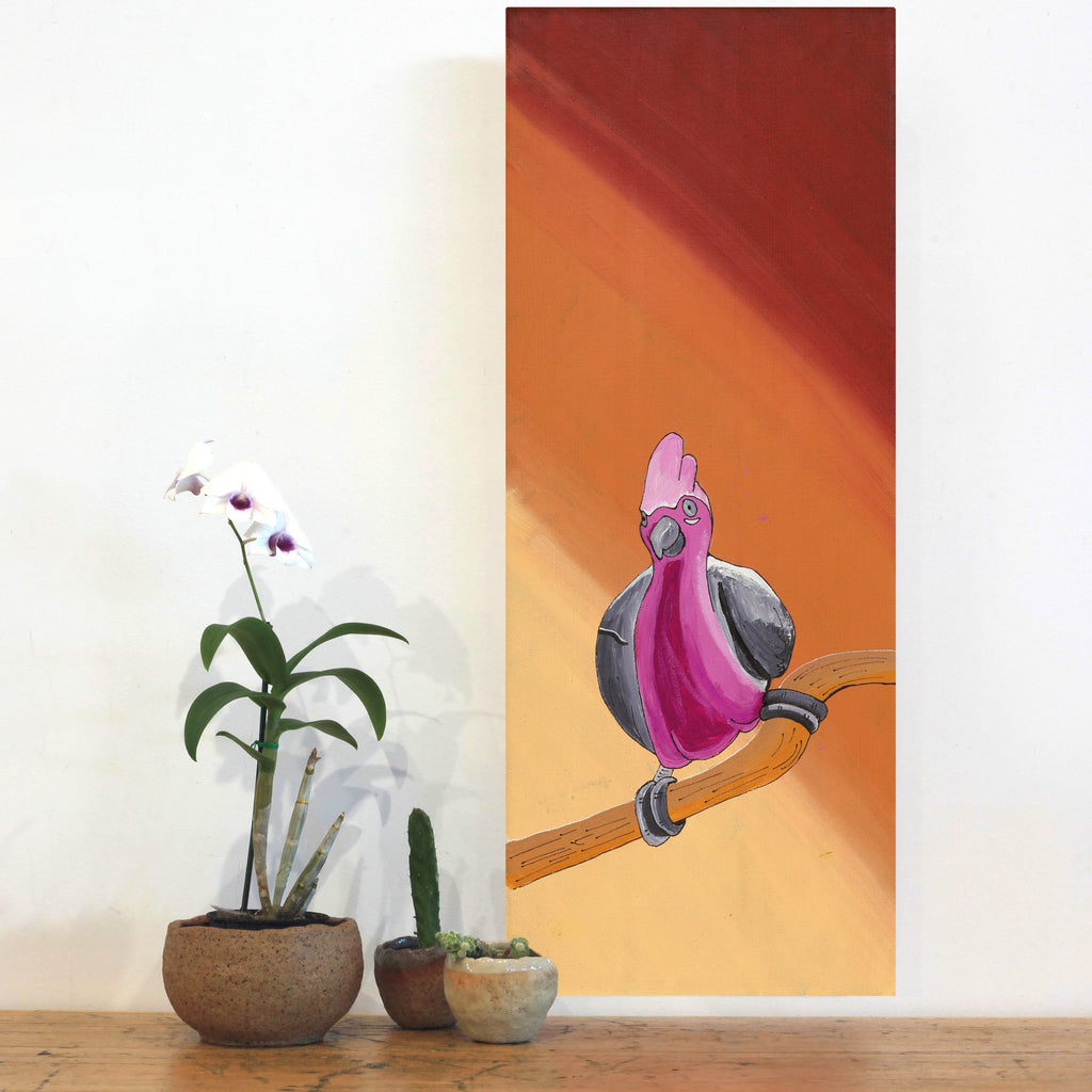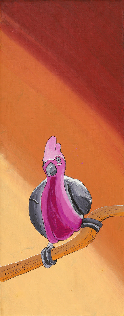 This painting depicts one of many ‘jurlpu’ (bird) species that live around Yuendumu. The bush around Yuendumu provides many different habitats for birds to live in. Many bird species live around waterholes and rivers, like the ‘pirniny-pirninypa’ (black fronted dotterel [Elseyornis melanops]) and Ngatijirri (budgerigar [Melopsittacus undulates]). Others live in the spinifex country, like the ‘nuwiyingki’ or ‘panngarra’ (cockatiel [Nymphicus hollandicus]). Still others make nests in trees, like the ‘juwayikirdi’ (grey crowned babbler [Pomatostomus temporalis]).