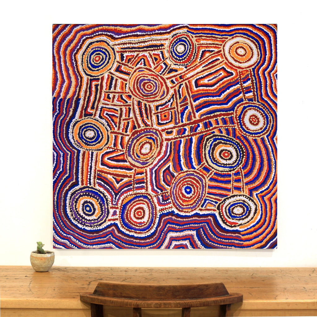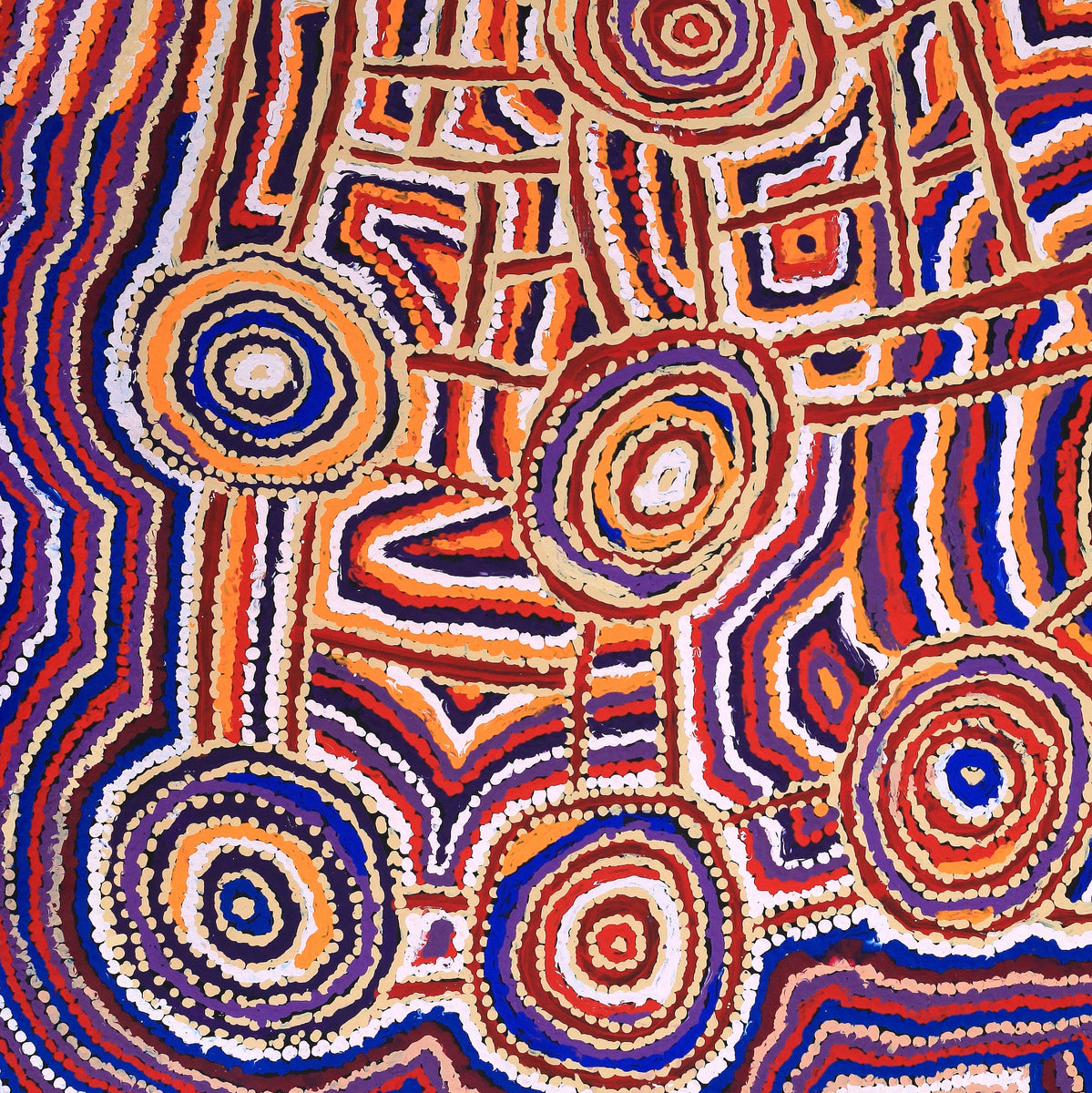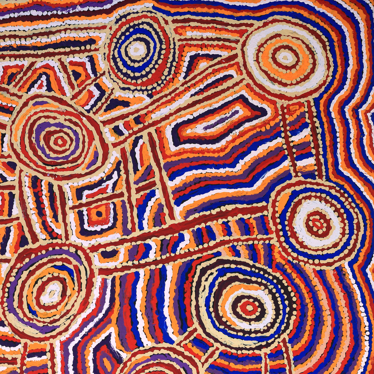This ‘Jukurrpa’ (Dreaming) comes from Mina Mina, a very important women’s Dreaming site far to the west of Yuendumu near Lake Mackay and the WA border. The ‘kirda’ (owners) of this Dreaming are Napangardi/Napanangka women and Japangardi/Japanangka men; the area is sacred to Napangardi and Napanangka women. There are a number of ‘mulju’ (water soakages) and a ‘maluri’ (clay pan) at Mina Mina.