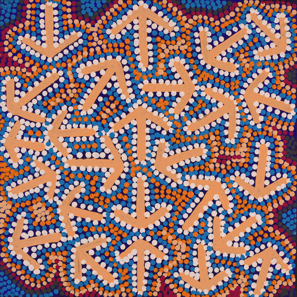 In contemporary Warlpiri paintings, traditional iconography can be used to represent the Jukurrpa, associated sites, and other elements. ‘Yankirri’ are usually represented by arrow-like shapes depicting their ‘wirliya’ (footprints) as they walk around.