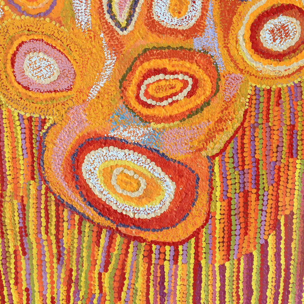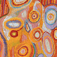 Jennifer was born at Mulga Park. She has seven children, and although they are now grown up, she is a busy woman, as she is the primary carer for several of her grandchildren. Jennifer has been working in the remote media industry off and on for 10 years, in Pipalyatjara, Irrunytju (Wingellina) and Umuwa. She is a skilled camera person and editor and has painted for both Ninuku Arts in Kalka, and Kayili Arts in Patjarr community. Jennifer’s time at Patjarr in Western Australia has informed her fluid and organic painting style. She is a natural colourist and most commonly depicts the Kungkarrakalpa Tjukurpa (or Seven Sisters Dreaming). She uses two implements - a brush and punu (small stick) - to create her compositions. Her paintings have great depth, which is created by the layers in her work, with some of her shapes appearing to float on the surface of the canvas. The colours she uses (and there are often many) flow into one another to create a blended effect.
