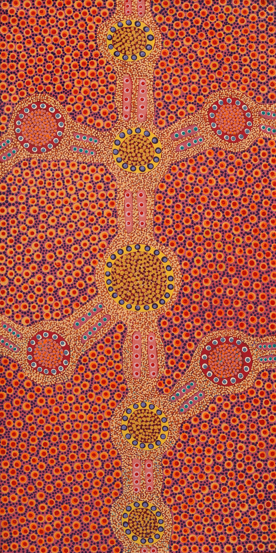 The site depicted in this painting is Puyurru, west of Yuendumu. In the usually dry creek beds are ‘mulju’ (soakages), or naturally occurring wells. The 'kirda' (owners) for this site are Nangala/Nampijinpa women and Jangala/Jampijinpa men. Two Jangala men, rainmakers, sang the rain, unleashing a giant storm. The storm travelled across the country from the east to the west, initially travelling with a ‘pamapardu Jukurrpa’ (termite Dreaming) from Warntungurru to Warlura, a waterhole 8 miles east of Yuendumu. At Warlura, a gecko called Yumariyumari blew the storm on to Lapurrukurra and Wilpiri. Bolts of lightning shot out at Wirnpa (also called Mardinymardinypa) and at Kanaralji. At this point the Dreaming track also includes the ‘kurdukurdu mangkurdu Jukurrpa’ (children of the clouds Dreaming). The water Dreaming built hills at Ngamangama using baby clouds and also stuck long pointy clouds into the ground at Jukajuka, where they can still be seen today as rock formations.