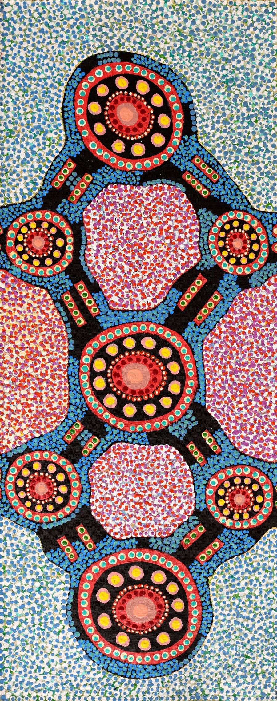 In contemporary Warlpiri paintings, traditional iconography is used to represent the ‘Jukurrpa’ (Dreaming). Short dashes are often used to represent ‘mangkurdu’ (cumulus & stratocumulus clouds), and longer, flowing lines represent ‘ngawarra’ (flood waters). Small circles are used to depict ‘mulju’ (soakages) and river bed.