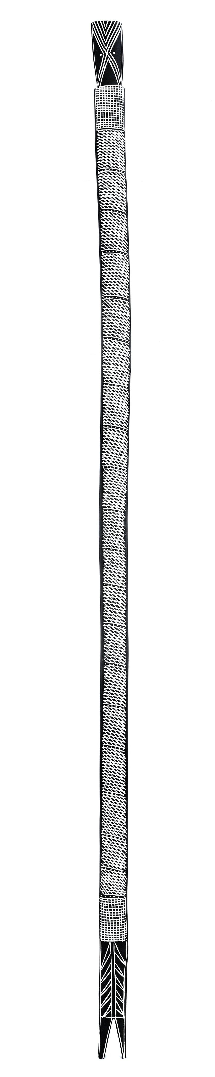 Ways of learning and schools of art in Arnhem Land are based around a system of passing knowledge and information on to others. The art here has its genesis in body design, rock art and cultural practices, in concert with more than 50 years of collaborations, travel and political action to retain ownership of country. Values and law are expressed through language, imagery, manikay (song), bunggul (dance), doloppo bim (bark painting), sculptures, and kun-madj (weaving) – the arts.