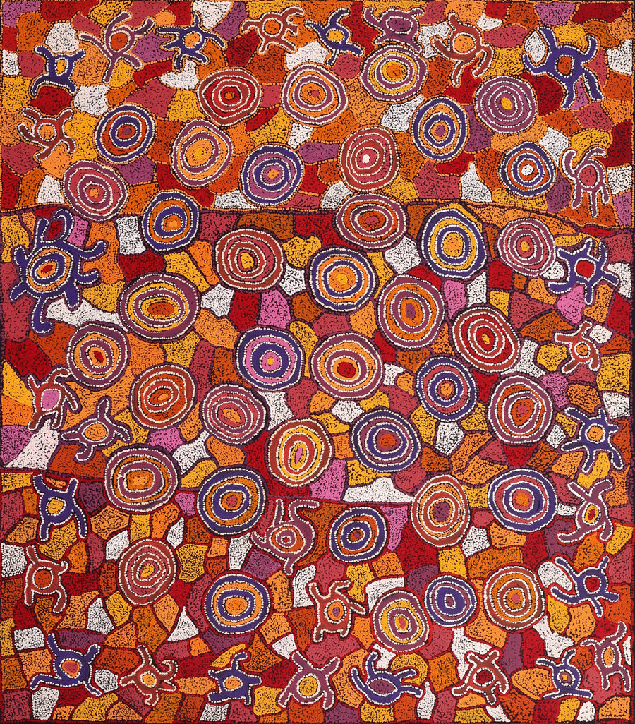 This artwork comes from Warlukurlangu Artists in Yuendumu. The art centre represents Warlpiri artists from Yuendumu and Nyirripi, located in the Tanami Desert northwest of Alice Springs. This remote region of red sand and open desert Country is central to the stories and knowledge shared through the paintings.