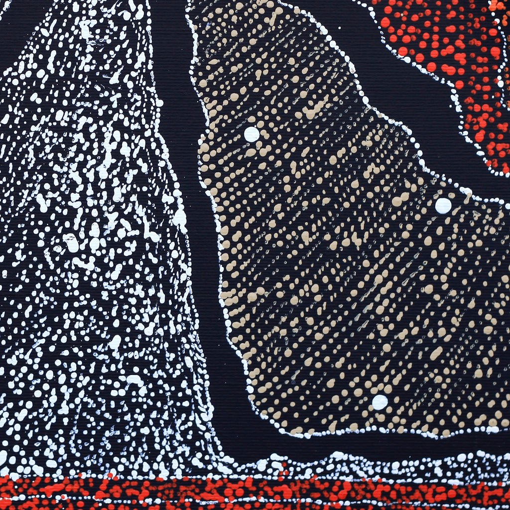 The site depicted in this painting is Pirlinyarnu (Mt. Farewell), about 165 km west of Yuendumu in the Northern Territory. The ‘kirda’ (owners) for the water Dreaming site at Pirlinyarnu are Nangala/Nampijinpa women and Jangala/Jampijinpa men.