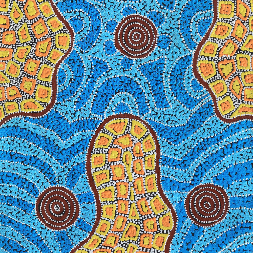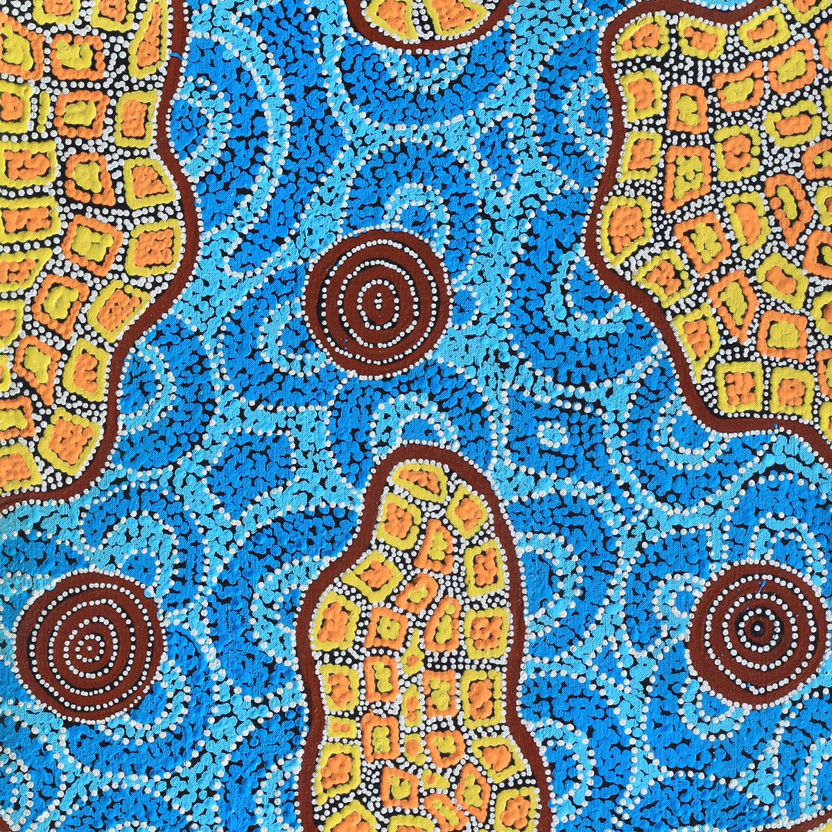 This ‘Jukurrpa’ (Dreaming) comes from Mina Mina, a very important women’s Dreaming site far to the west of Yuendumu near Lake Mackay and the WA border. The ‘kirda’ (owners) of this Dreaming are Napangardi/Napanangka women and Japangardi/Japanangka men; the area is sacred to Napangardi and Napanangka women. There are a number of ‘mulju’ (water soakages) and a ‘maluri’ (clay pan) at Mina Mina.
