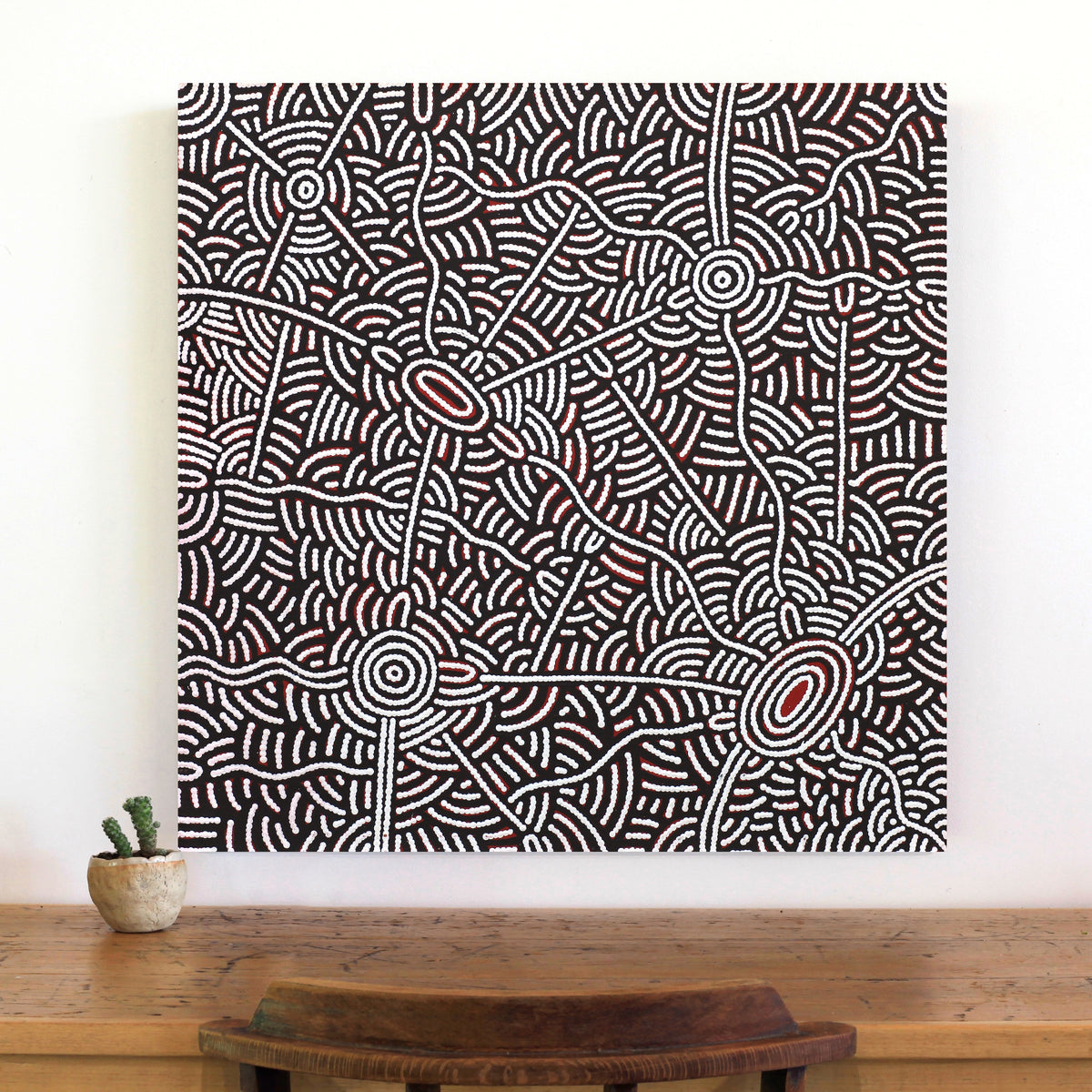 The site depicted in this painting is Pirlinyarnu (Mt. Farewell), about 165 km west of Yuendumu in the Northern Territory. The ‘kirda’ (owners) for the water Dreaming site at Pirlinyarnu are Nangala/Nampijinpa women and Jangala/Jampijinpa men.