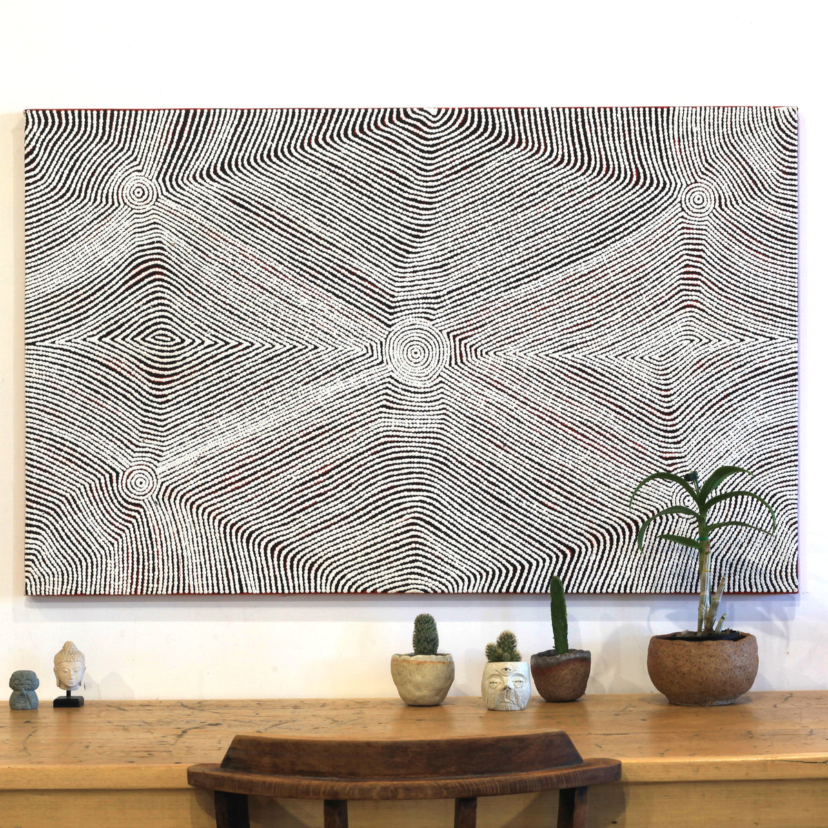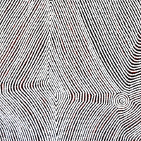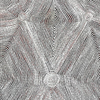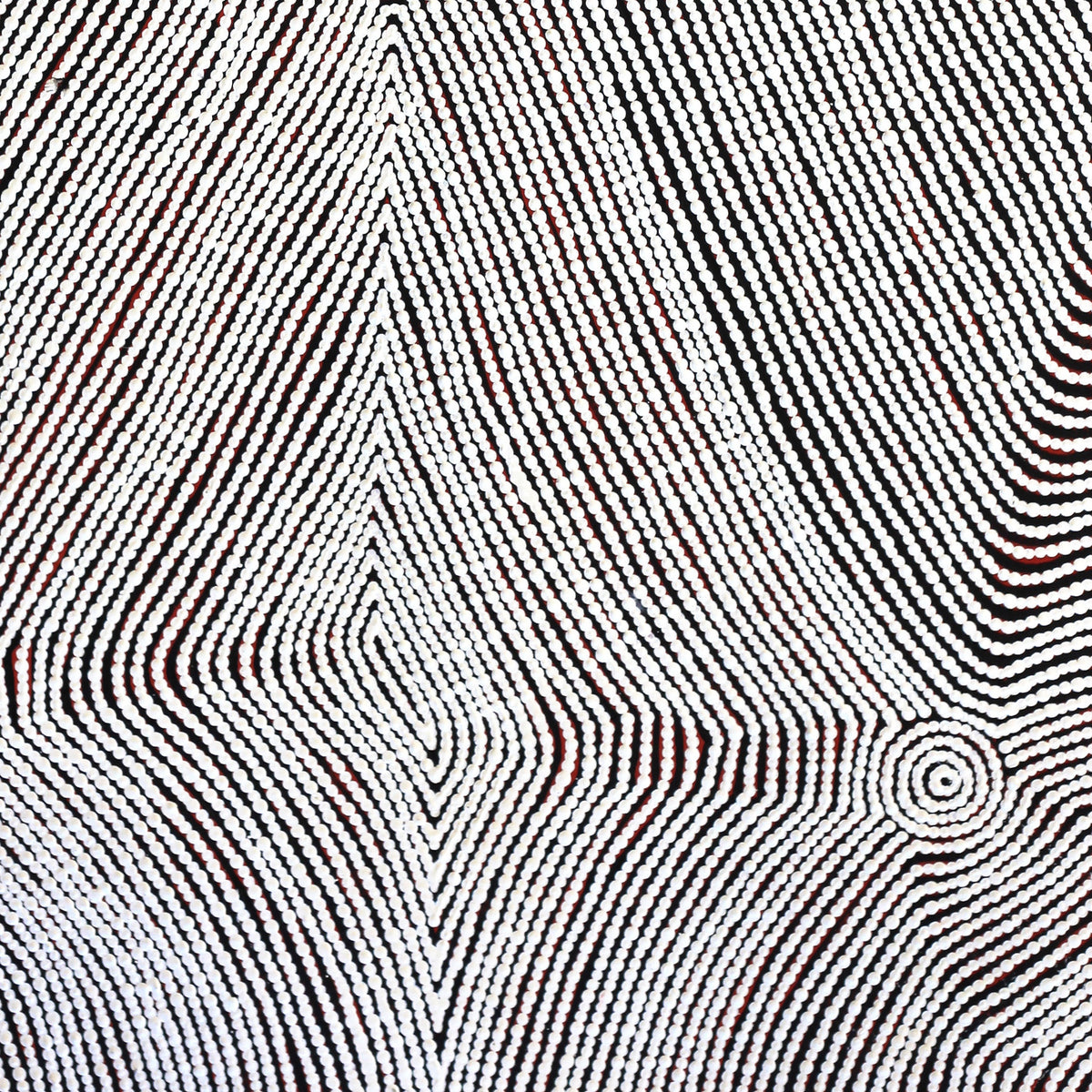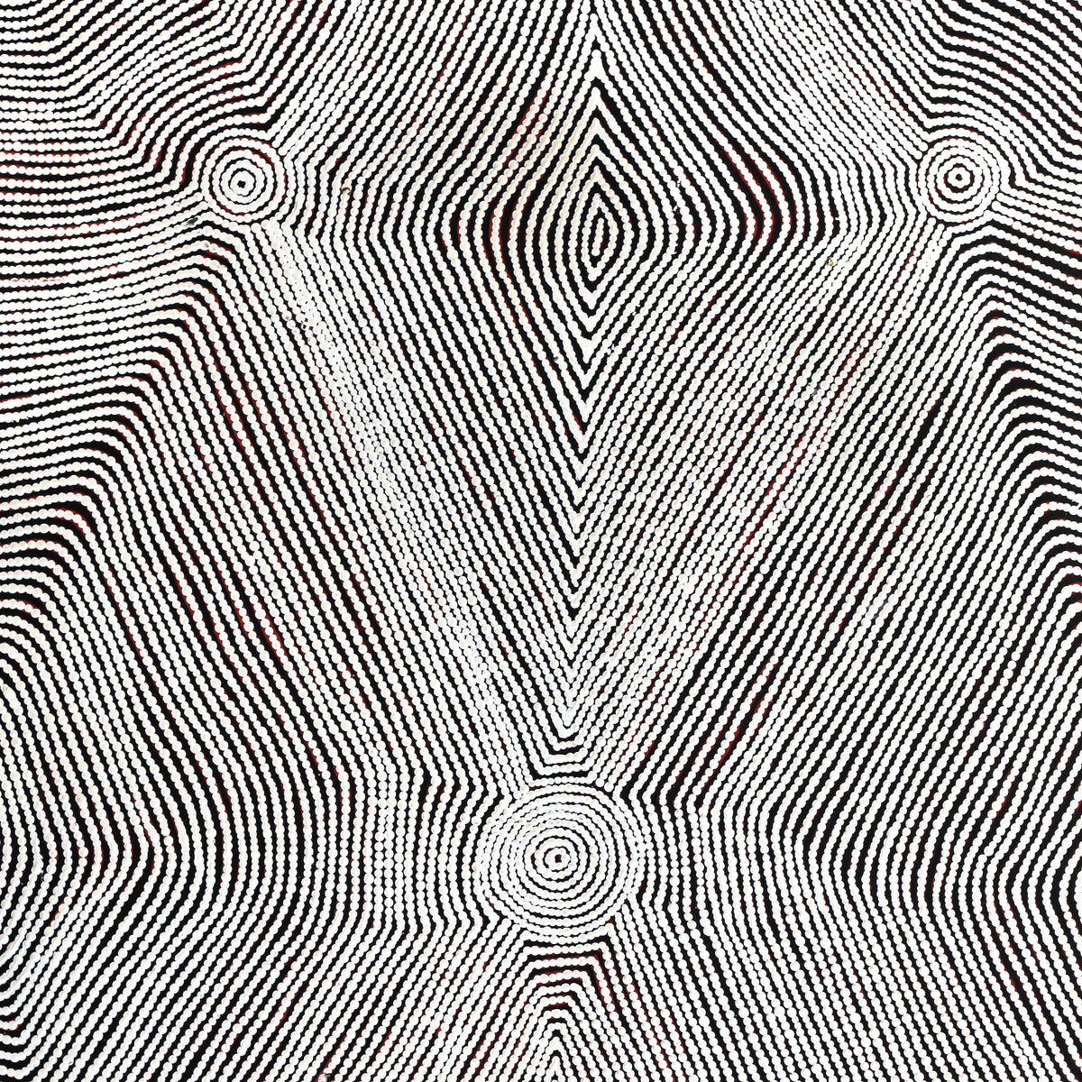 The site depicted in this painting is Pirlinyarnu (Mt. Farewell), about 165 km west of Yuendumu in the Northern Territory. The ‘kirda’ (owners) for the water Dreaming site at Pirlinyarnu are Nangala/Nampijinpa women and Jangala/Jampijinpa men.