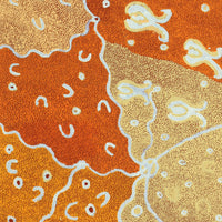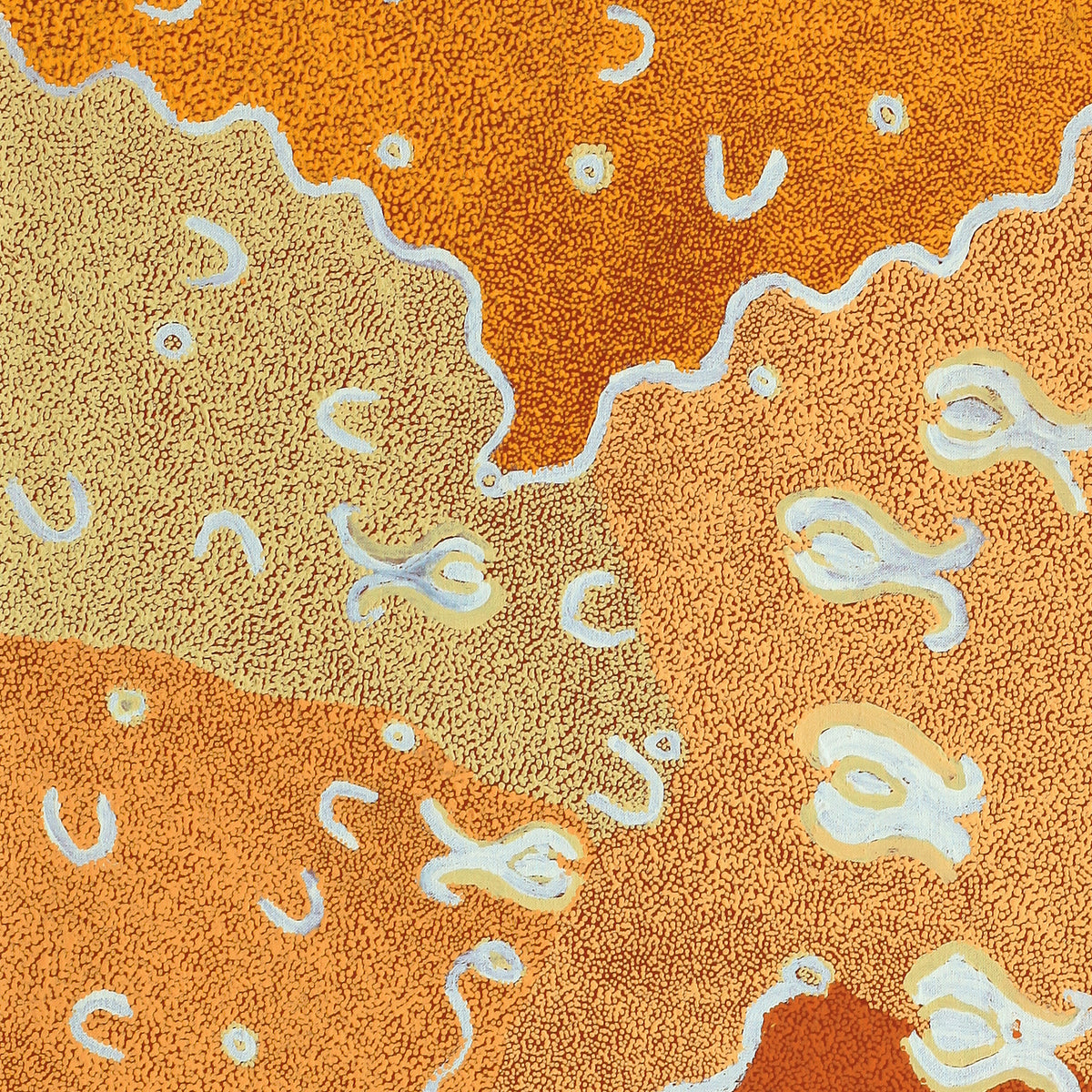 Leonie depicts the Talapa Tjukurrpa (Lizard Dreaming) at Lingakurra (orange tongue) country, located south east of Kintore. This is the country and Tjukurrpa of her grandfather, Mutiyuriyuri. The story was passed down to Leonie’s father, Kamutu and then to her from her brother. In this Tjukurrpa, Talapa women (Black and yellow lizards) makie ceremony around the waterhole, drink the water from it and dance around it. Leonie depicts the tali (sandhills), puli (rocks) and kapi (rochholes) that dominate the country. The Talapa are sometimes depicted going into their holes where they live or moving amongst the landscape in search of bush tucker. Leonie also depicts the lightning Tjukurrpa on Lingakurra country where the Talapa women sit around the fire as a lightning storm passes over them.