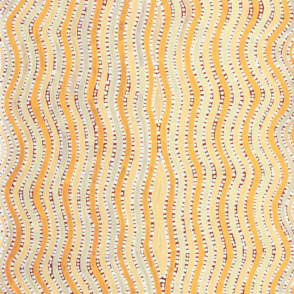 This painting shows the sandhills (tali tali) at Kungkayunti (Brown's Bore). Kungkayunti is the place where the ancestral women are dancing along the creek bed.