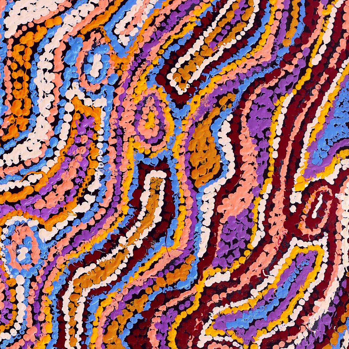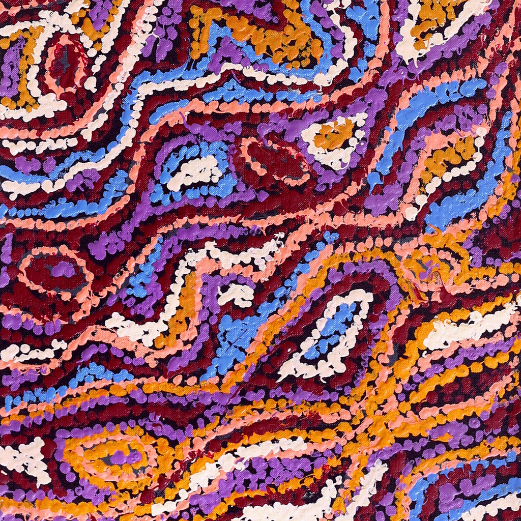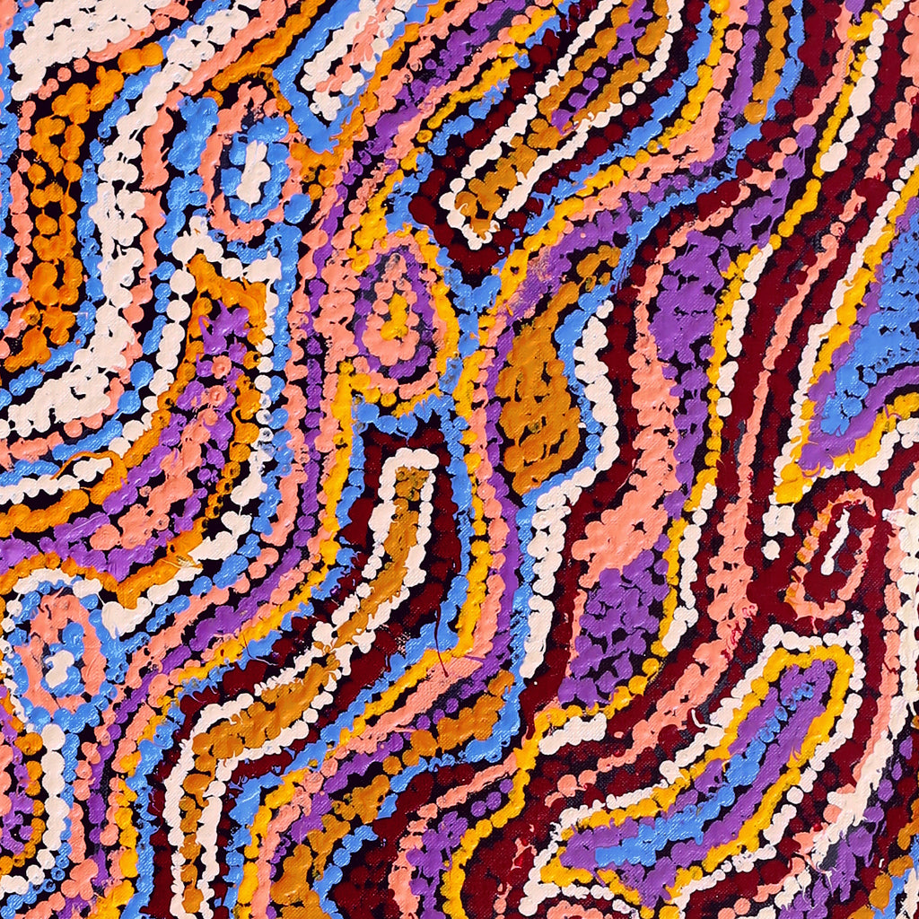 The subject of this work is Lappi Lappi, a rock hole near Lake Hazlett, about 90 km northwest of Lake Mackay in Western Australia. The country belongs to Nampijinpa/Jampijinpa and Nangala/Jangala skin groups. Located in a sheltered basin, the rock hole at Lappi Lappi is a permanent source of water, and is surrounded by country rich in bush tucker. In the time of the Jukurrpa (Dreamtime) many mothers with young children would gather there because it was a safe place to stay. The rock hole at Lappi Lappi is home to a ‘warnayarra’, a rainbow serpent that travels underground between various rock holes. One day, women were gathered at the rock hole with their children, singing and dancing. When the ‘warnayarra’ heard the sound of voices, it travelled silently towards them, under the water. When it reached the edge of the rock hole, it rose out of the water and ate them all.