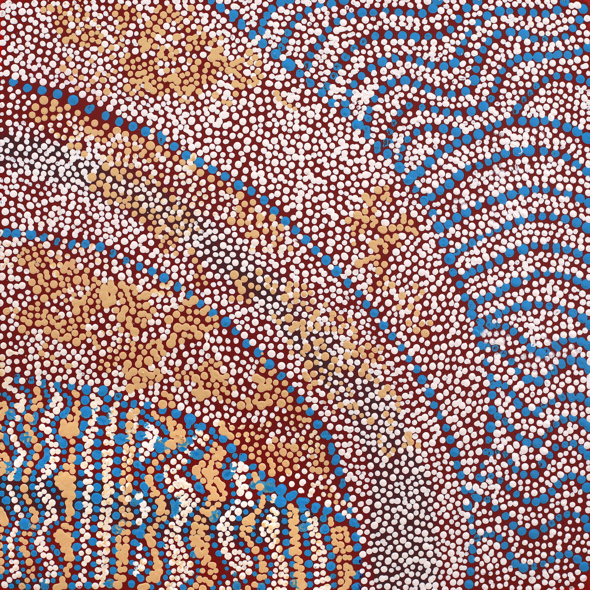 The ‘kirda’ (owners) of this country are Napangardi/Napanangka women and Japangardi/Japanangka men, who can depict portions of the Mina Mina Jukurrpa in their paintings. There are a number of different components of the Mina Mina Jukurrpa; artists usually choose to depict one particular aspect. These can include ‘karnta’ (women), ‘karlangu’ (digging sticks), ‘majardi’ (hairstring skirts/tassels), ‘ngalyipi’ (snakevine [Tinospora smilacina]), ‘jintiparnta’ (desert truffle [Elderia arenivaga]), and ‘kurrkara’ (desert oak [Allocasuarina decaisneana]).