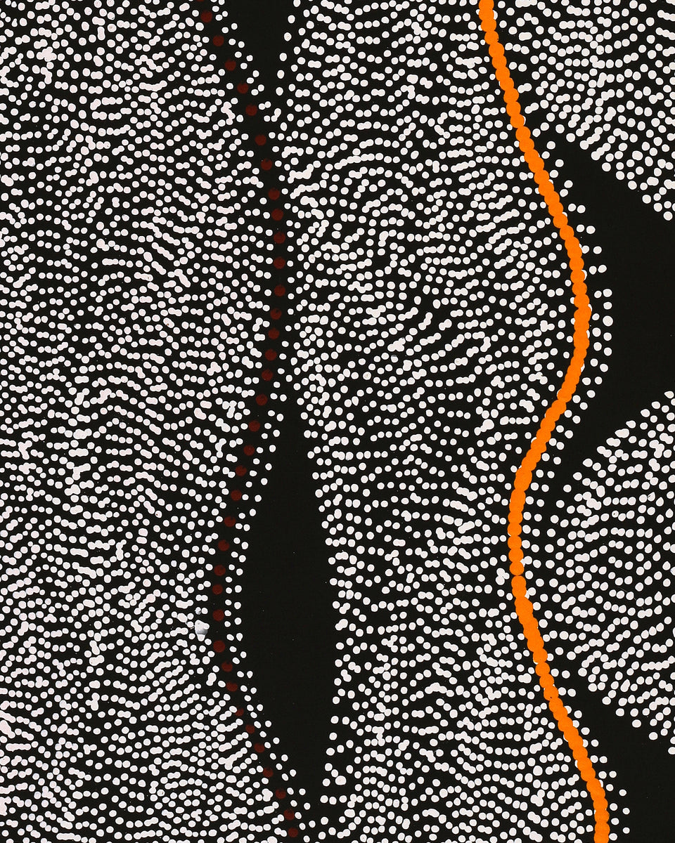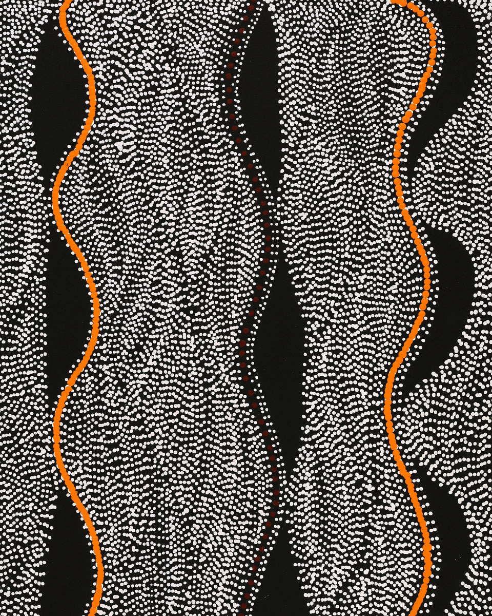 This painting tells the story of a Jangala ‘watiya-warnu’ (Acacia tenuissima) ancestor who travelled south from a small hill called Ngurlupurranyangu to Yamunturrngu (Mount Liebig). As he travelled he picked the ‘watiya-warnu’ seeds and placed them in ‘parrajas’ (food carriers), one of which he carried on his head. Watiya-warnu is a seed bearing tree that grows in open spinifex or mulga country. When people returned to their camp after collecting the seeds they would make large windbreaks for shelter and winnow the seed in the late afternoon. Immature ‘watiya-warnu’ seed is ground into a paste and can be used to treat upset stomachs. The associated ‘watiya-warnu’ ceremony involves the preparation of a large ground painting. This Jukurrpa belongs to Nampijinpa/Nangala women and Jampijinpa/Jangala men. In contemporary Warlpiri paintings traditional iconography is used to represent the Jukurrpa, particular sites and other elements. In paintings of this Dreaming ‘U’ shapes are often depicting women collecting the ‘watiya-warnu’ seeds. Oval shapes represent the ‘parrajas’ where they carry the seeds and strait lines beside them frequently portrait digging sticks.