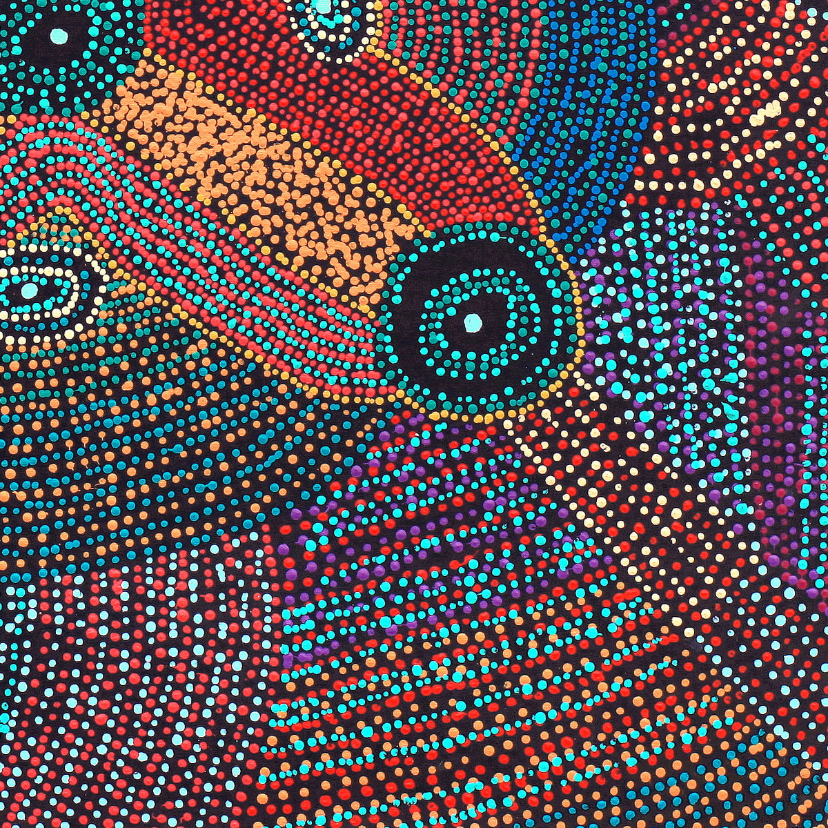 Megan began painting with Warlukurlangu Artists Aboriginal Corporation, an Aboriginal owned and governed art centre located in Yuendumu and Nyirripi, in 2016. “I like colours and patterns . . . they make me happy . . . I paint my Grandmother’s Story”. Her grandmother’s country is Karrku – a large hill and the home of a sacred ochre mine (Mount Stanley), a 20-minute drive from Nyirrpi. Megan uses colour and patterns which she creatively combines to blend traditional motifs with her own ideas of modern design to represent her grandmother’s country.